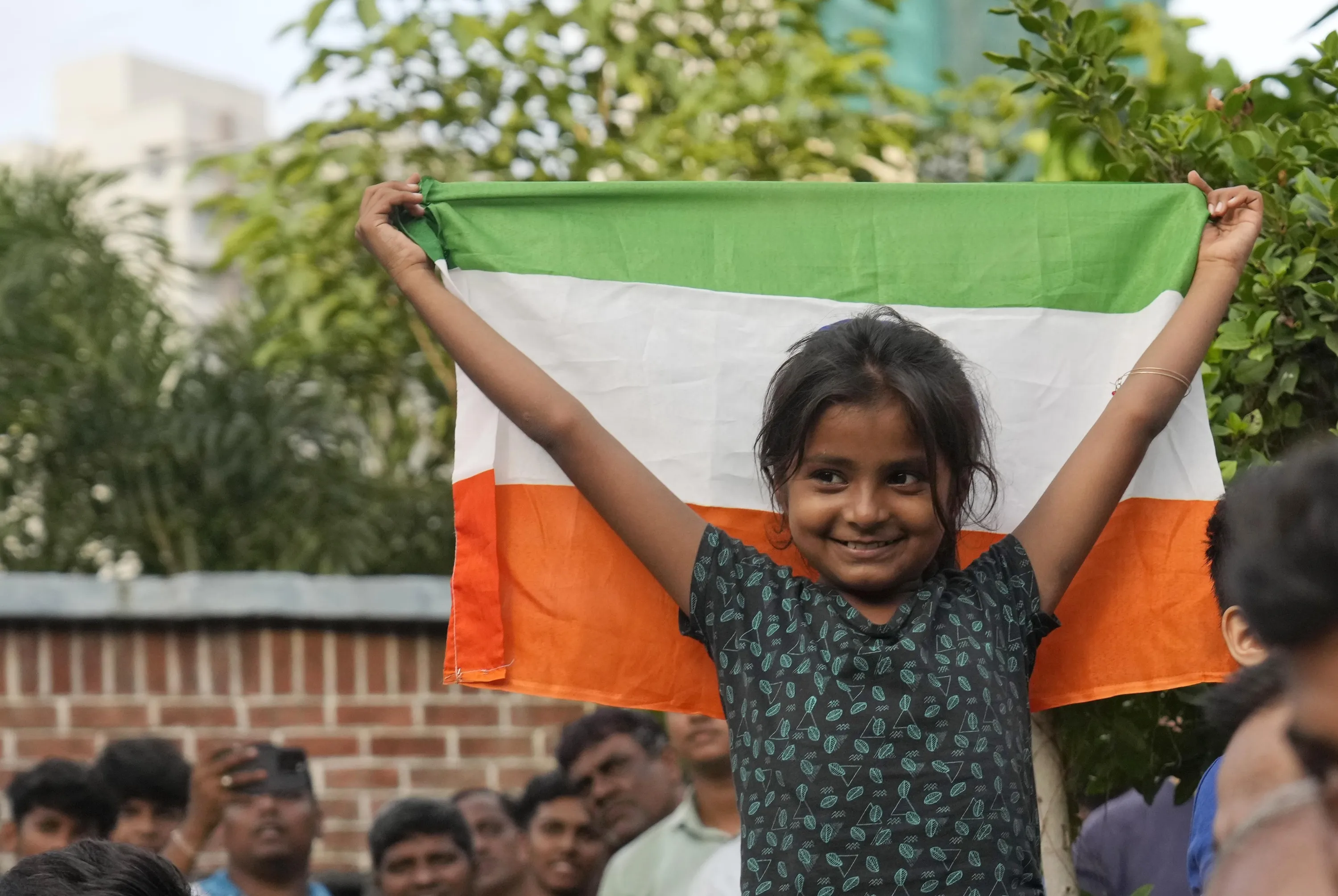 A girl stands with the Indian national flag as she watches a live telecast of the landing og Chandrayaan-3, or “moon craft” in Sanskrit, in Mumbai, India, Wednesday, August 23, 2023. (Photo by Rajanish Kakade/AP Photo)