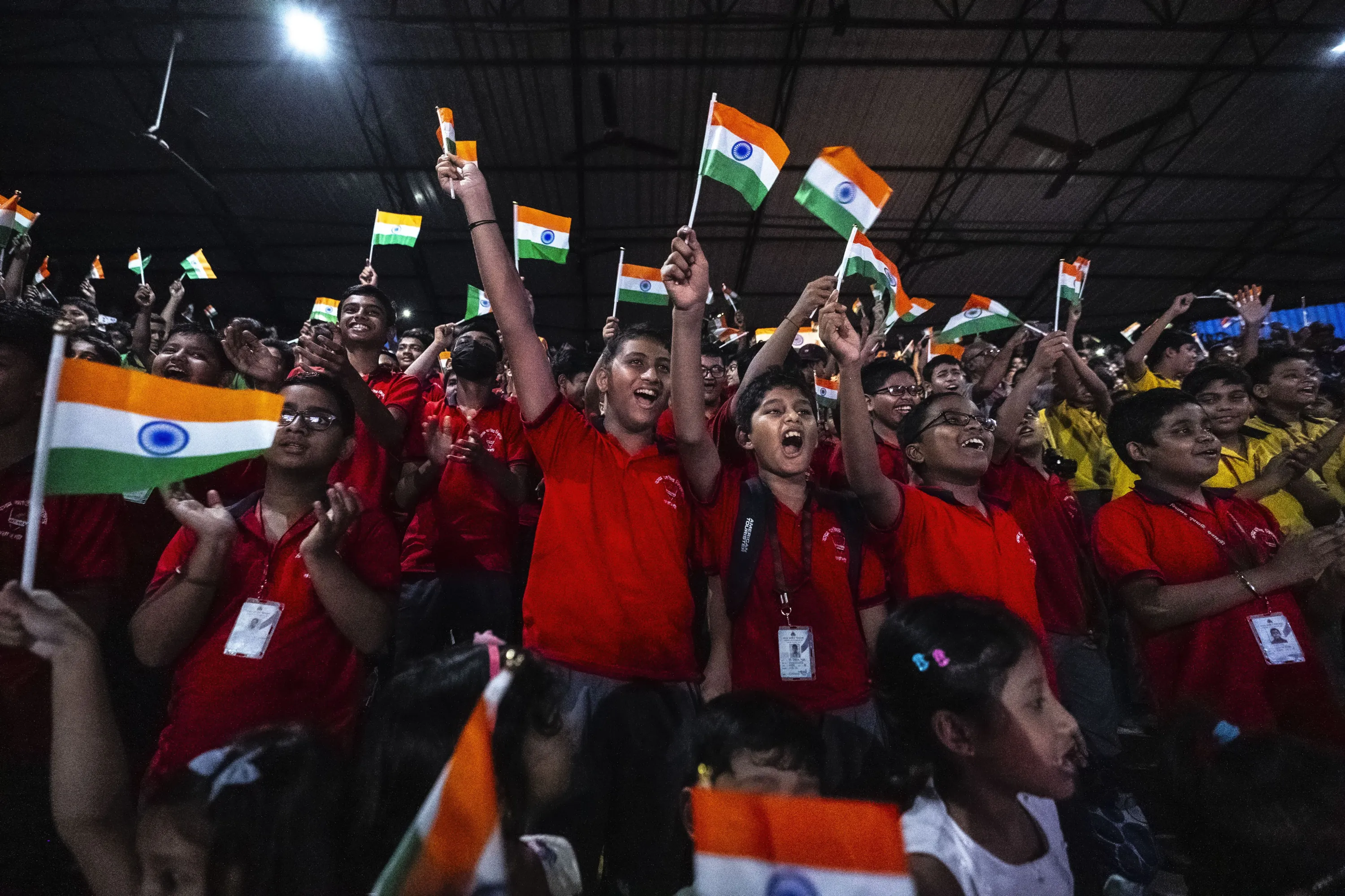 Schoolchildren celebrate the successful landing of spacecraft Chandrayaan-3 on the moon, in a school in Guwahati, India, Wednesday, August 23, 2023. (Photo by Anupam Nath/AP Photo)