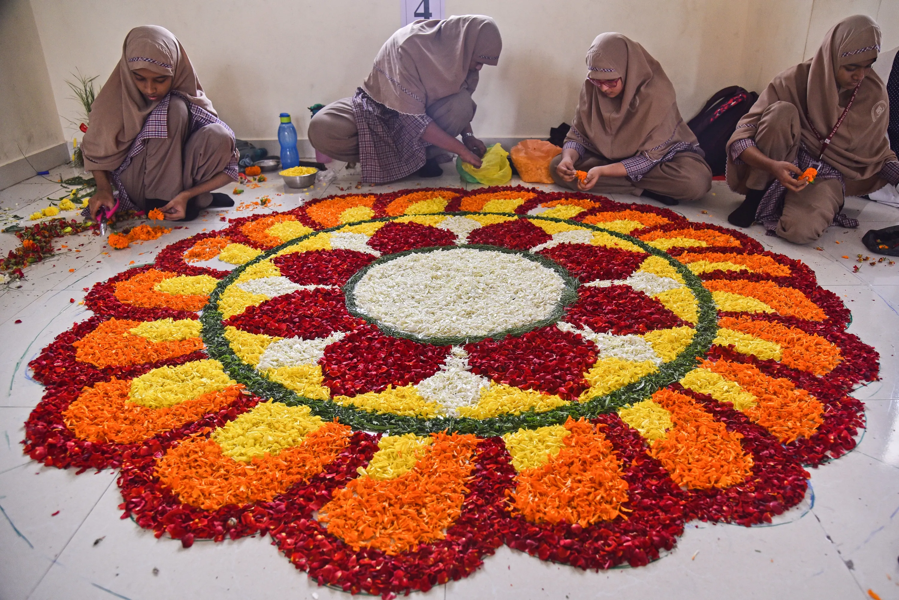 Indian Muslim students decorate a flower carpet or 'Pookalam' during a flower carpet competition as part of the Onam festival celebrations in Chennai, India, 24 August 2023. The Onam festival is a 10-day long harvest festival and is celebrated mostly in India's southern state of Kerala. Malayalam people in India and across the world put decorated flower beds in front of their houses to welcome King Mahabali, a past ruler of Kerala in southern India. (Photo by Idrees Mohammed/EPA)