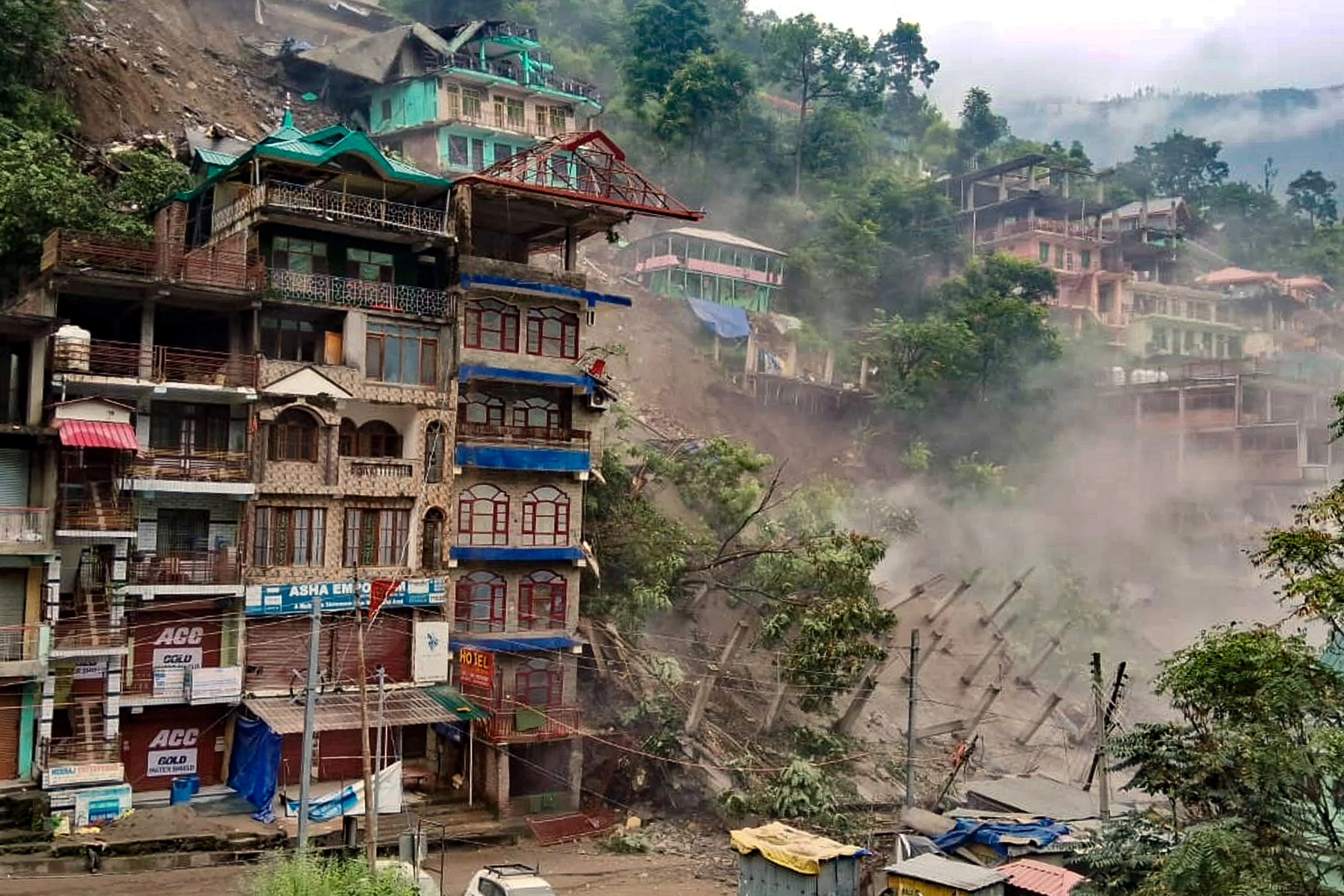 Several buildings collapse after massive landslides following heavy rainfall at Kullu's Anni town, in India's Himachal Pradesh state on August 24, 2023. (Photo by AFP Photo/Stringer)