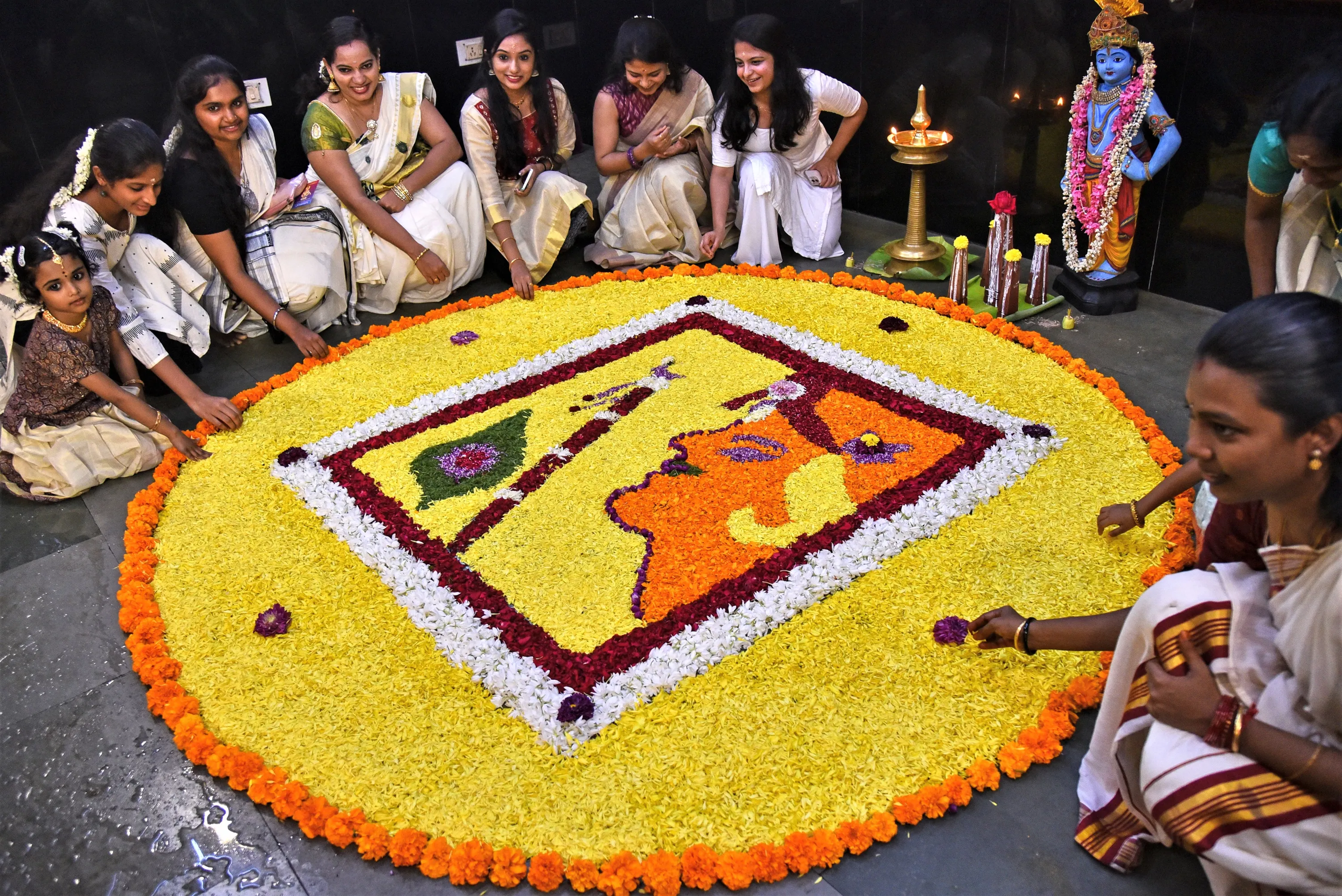 Malayali community members prepare a flower carpet or “Pookalam” as they celebrate the Onam festival, at Sree Ayyappan Guruvayurappan temple, in Chennai, India, 29 August 2023. The Onam festival is a 10-day long harvest festival and is celebrated mostly in India's southern state of Kerala. Malayalam people in India and across the world put decorated flower beds in front of their houses to welcome King Mahabali, a past ruler of Kerala in southern India. (Photo by Idrees Mohammed/EPA)