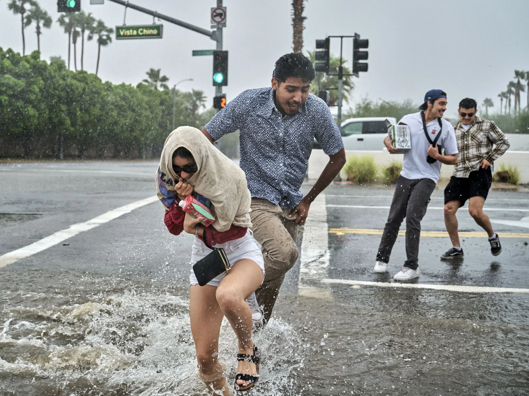 People cross a flooded street during a rainstorm as Tropical Storm Hilary arrives Palm Springs, California on August 20, 2023. Southern California is under a tropical storm warning which could bring heavy rains, high winds and flooding. (Photo by Philip Cheung for The Washington Post)