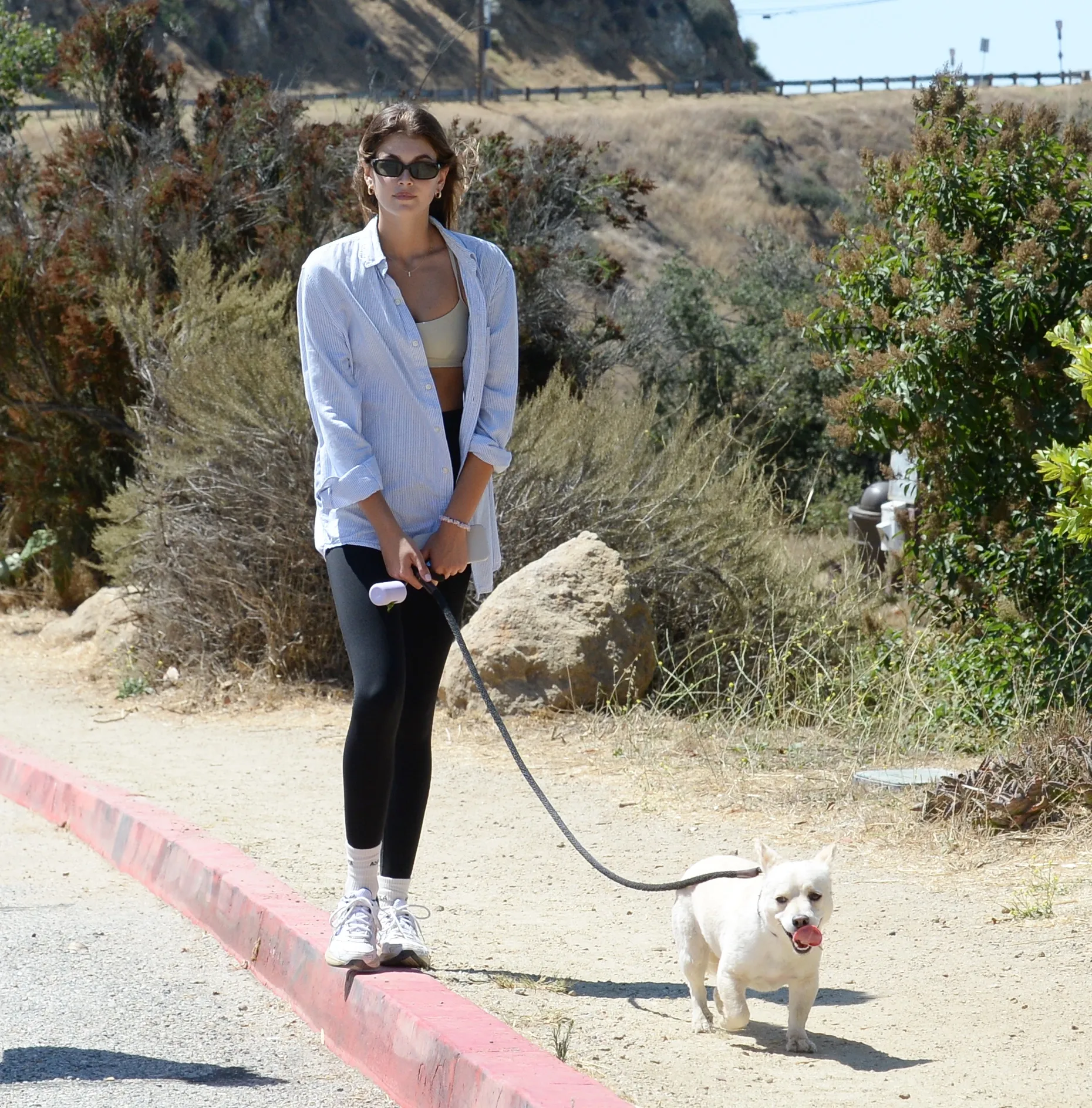 American model Kaia Gerber heads out for a hike with fellow model Alay Bowker in Los Angeles on August 16, 2023. Kaia wore a blue blouse, white crop top, black leggings, white socks, and matching sneakers. (Photo by The Image Direct)