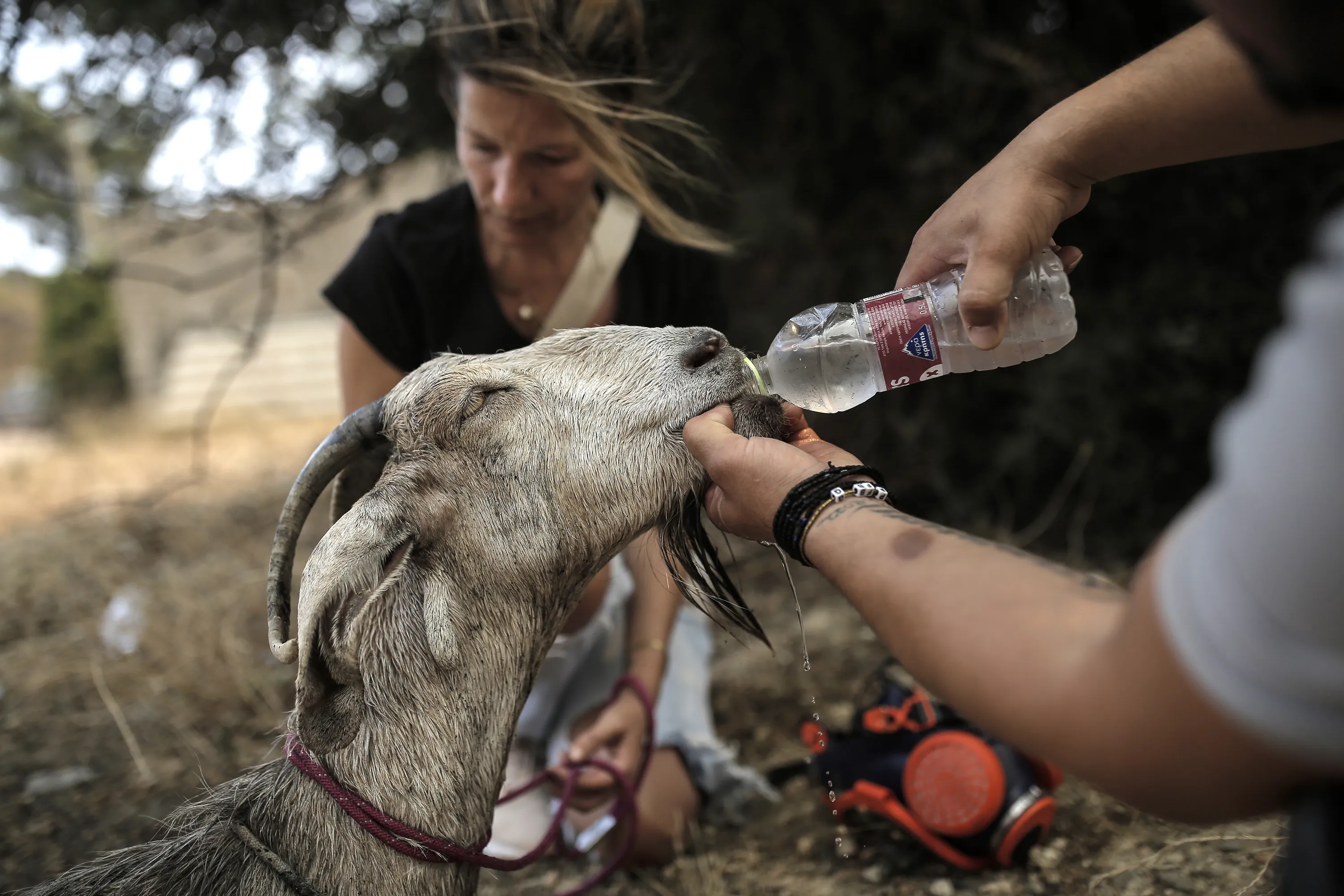 A volunteer of “Empty the Cages” animal rescue team gives water to a goat that was severely injured during a wildfire at a residential area located at the foot of Parnitha mountain in the outskirts of Athens, Greece, 23 August 2023. Fire Brigade forces continue to battle a series of fire fronts across the country as a total of 209 wildfires broke out in the last three days. The wildfire that broke out on 22 August in the area of Fyli has affected areas south of Mount Parnitha, in the outskirts of Athens. A total of 65 fire engines with 202-member crew, nine teams of firefighters on foot assisted by 7 firefighting aircraft (including two from Sweden and two from Germany) and 8 water dropping helicopters, are currently battling the blaze, the Fire Brigade said. (Photo by Kostas Tsironis/EPA)