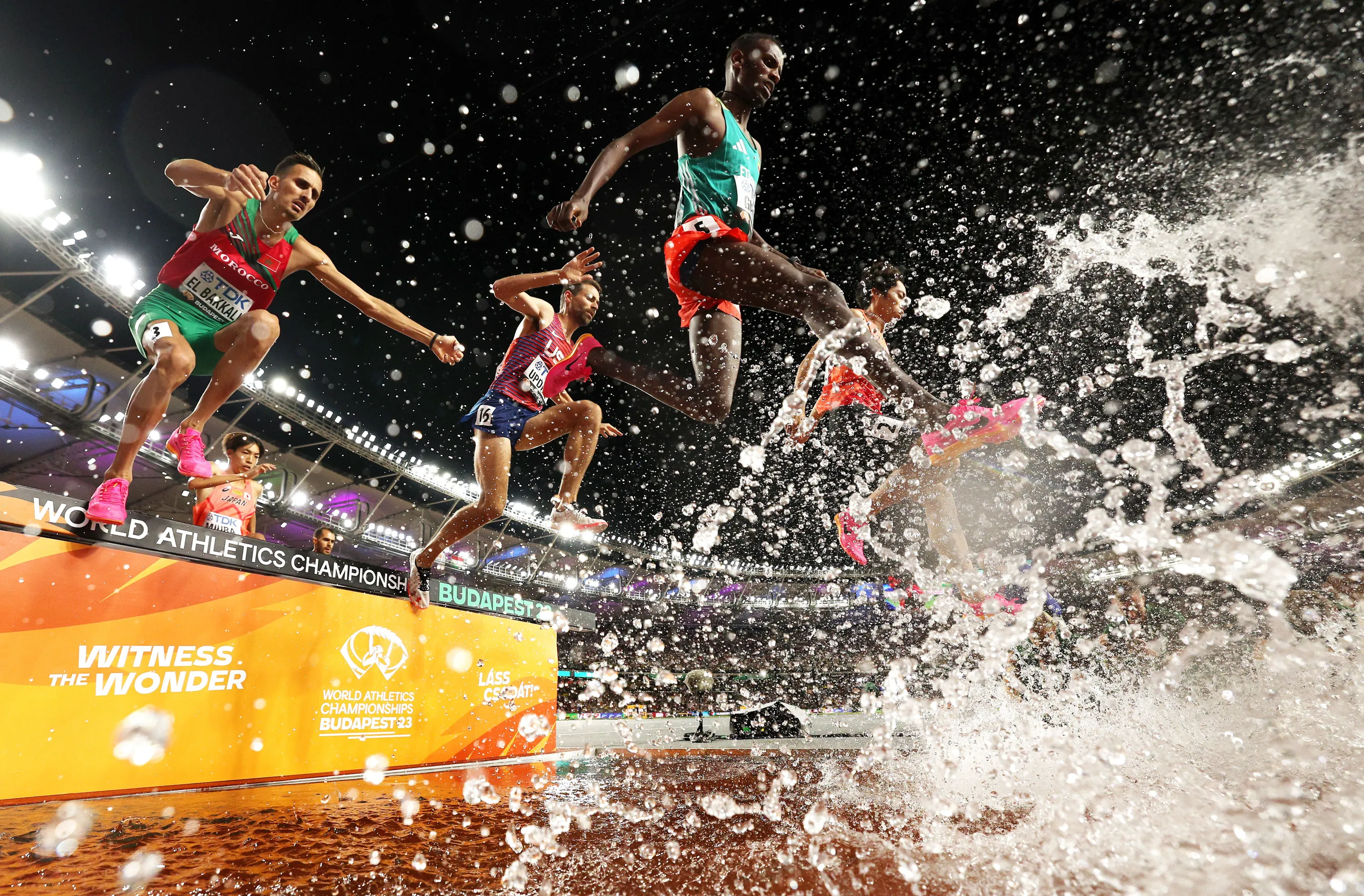 Athletes jump through the water in the Men's 3000m Steeplechase Final during day four of the World Athletics Championships Budapest 2023 at National Athletics Centre on August 22, 2023 in Budapest, Hungary. (Photo by Patrick Smith/Getty Images)