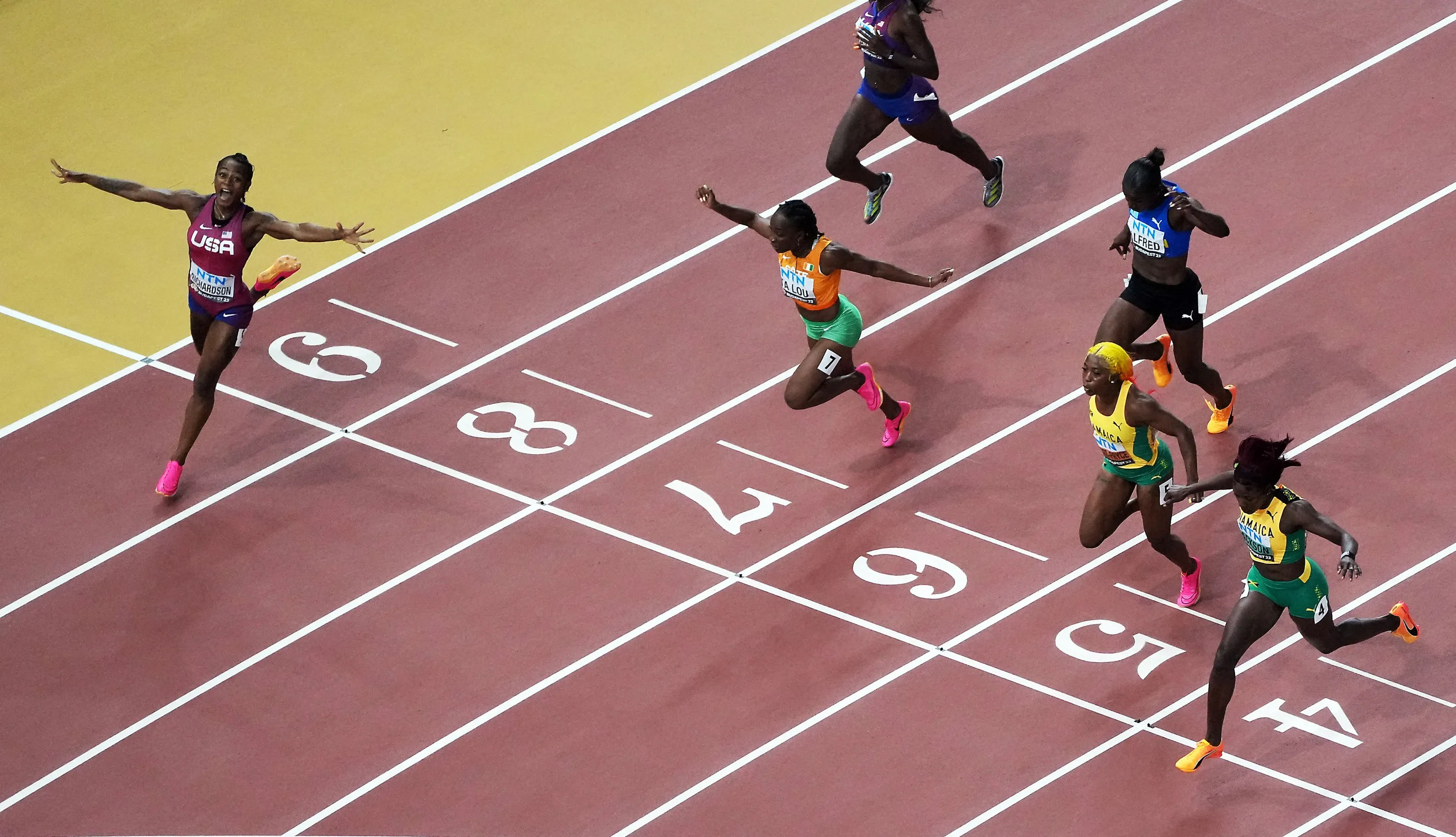 Sha'Carri Richardson of the United States celebrates as she crosses the line in lane nine to win the Women's 100m Final during the World Athletics Championships, at the National Athletics Centre on August 21st, 2023 in Budapest, Hungary. (Photo by Fabrizio Bensch/Reuters)