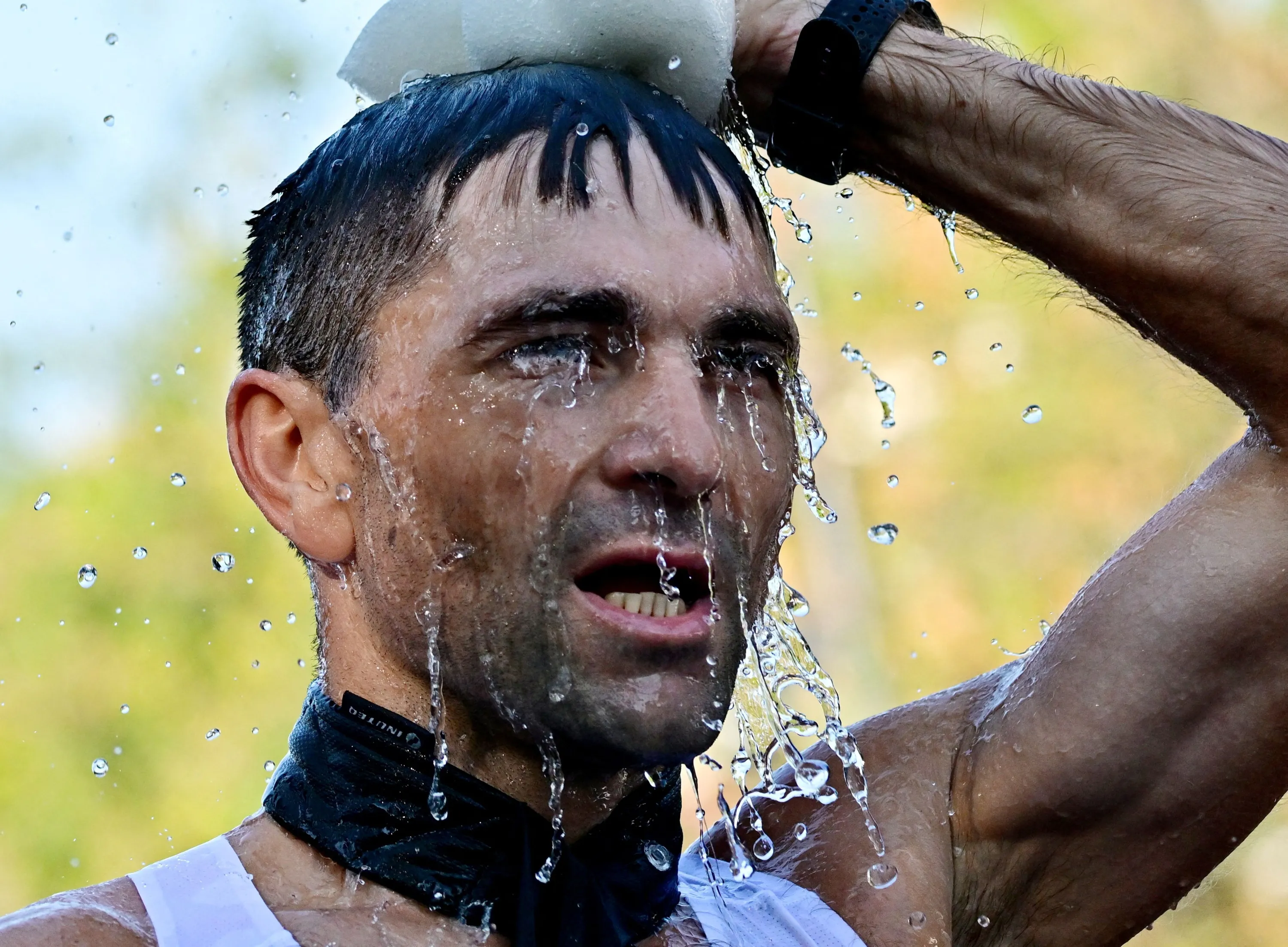 Ukraine's Ihor Hlavan pours water over himself during the men's 35 km race walk at the World Athletics Championship in Budapest, Hungary on August 24, 2023. (Photo by Marton Monus/Reuters)
