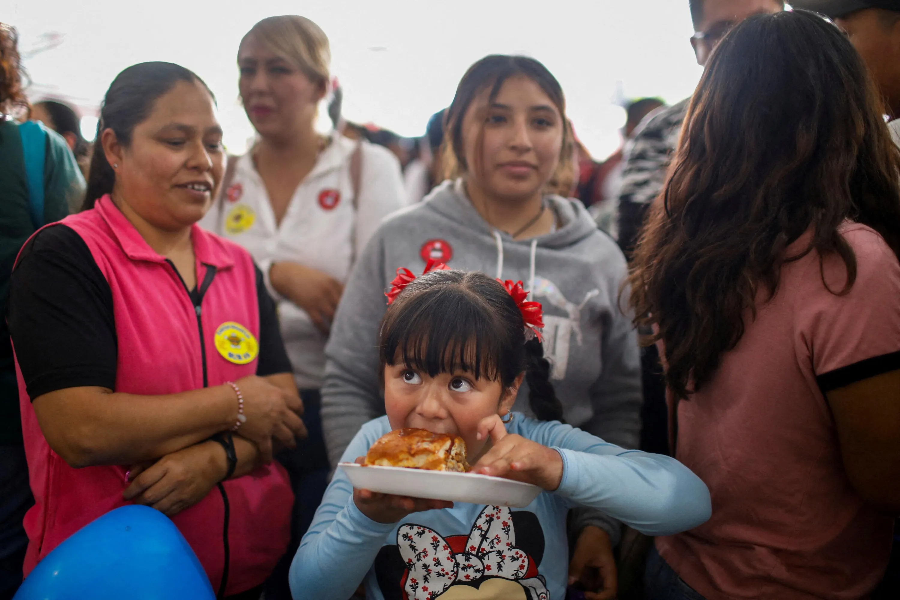 A girl bites a piece of a giant sandwich as people participate in an event to set a new record for the longest sandwich ever made, measuring 75.20 meters long, in Mexico City, Mexico.on August 2, 2023. (Photo by Raquel Cunha/Reuters)