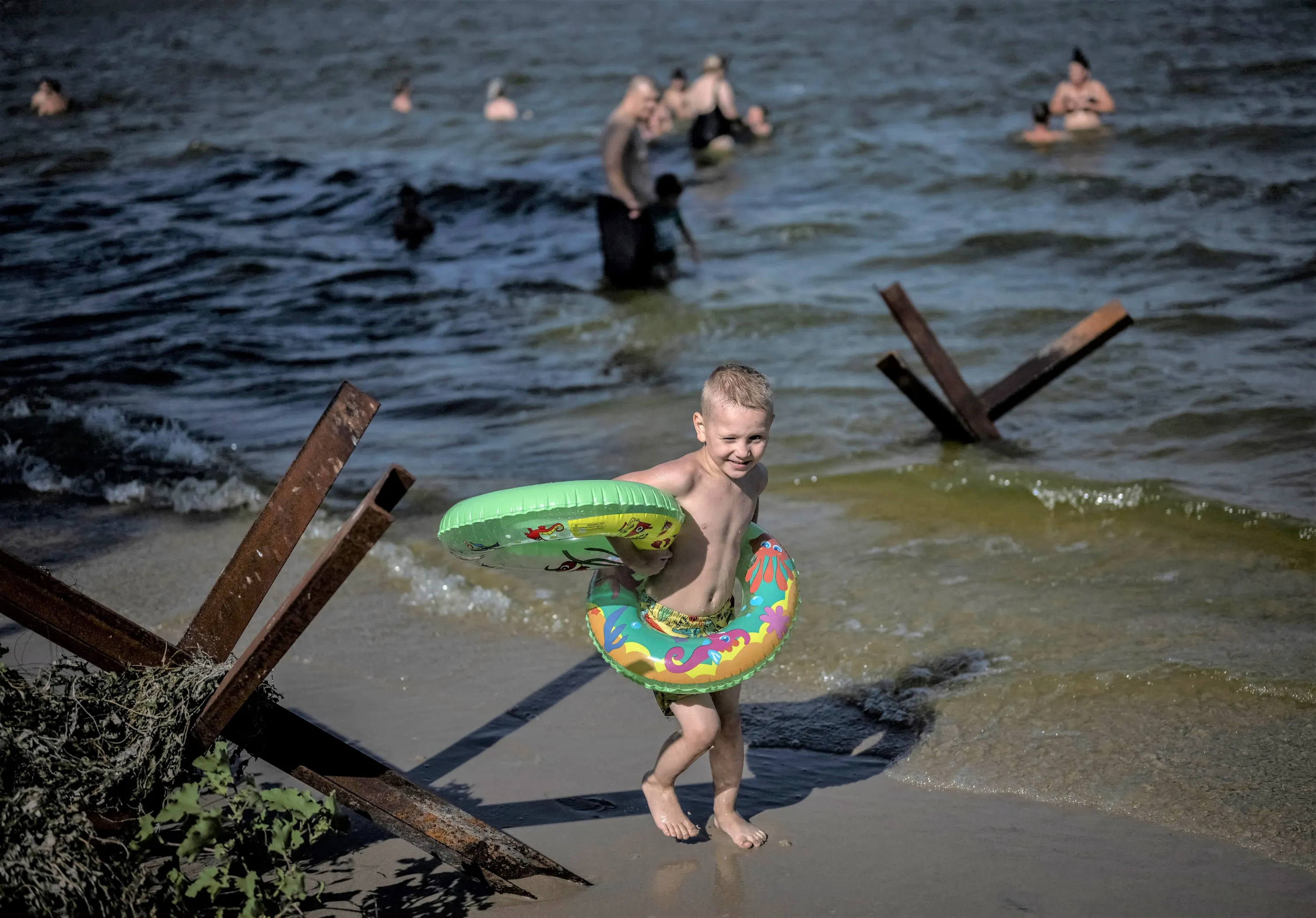 A boy plays near an anti-tank construction at the bank of Dnipro river as temperature reached 40 degrees Celsius (104 degrees Fahrenheit), amid Russia's attack on Ukraine, in Zaporizhzhia, Ukraine on August 6, 2023. (Photo by Viacheslav Ratynskyi/Reuters)