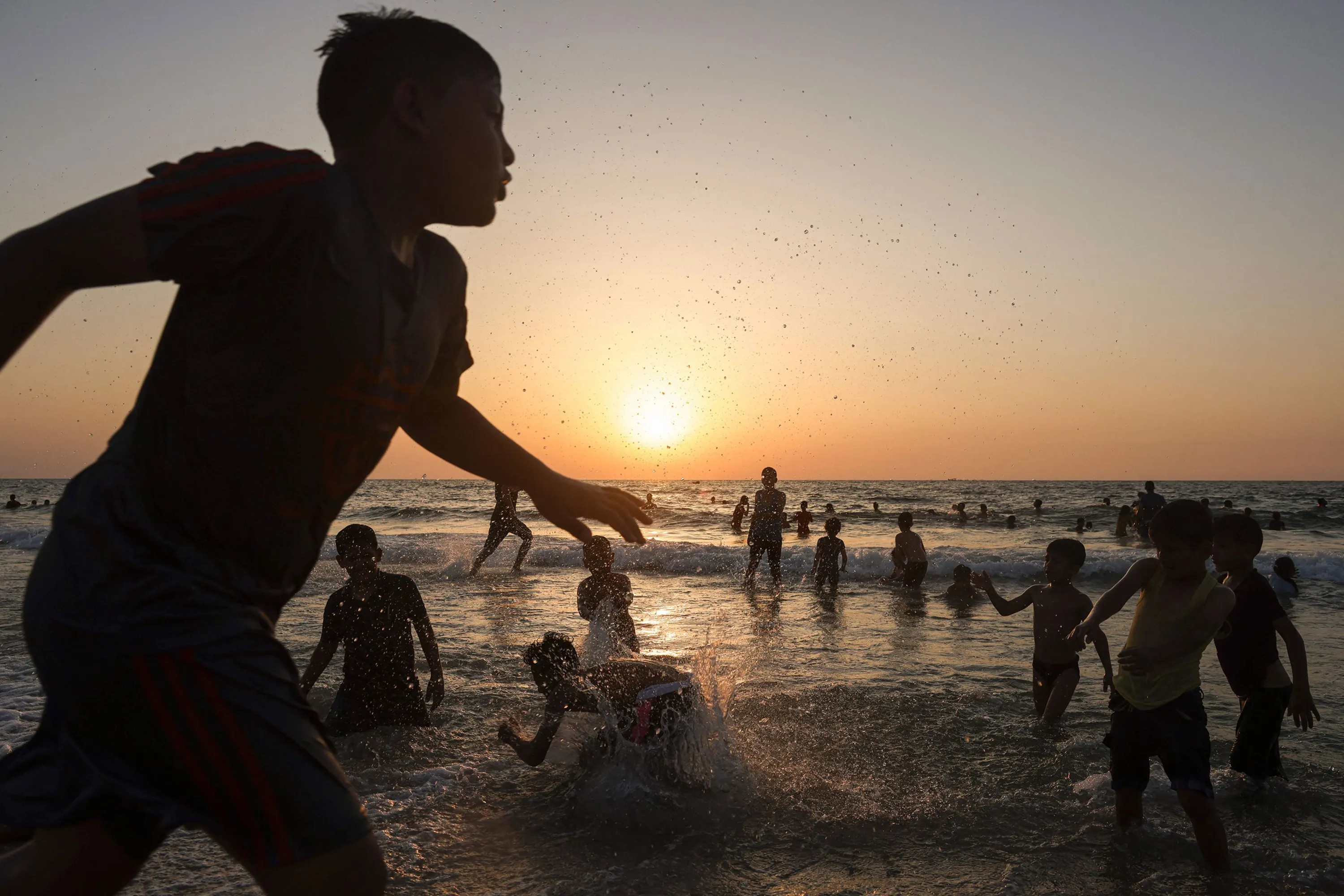 Children play in the water at the beach in Gaza City on July 27, 2023, amidst soaring temperatures and power cuts. (Photo by Mohammed Abed/AFP Photo)