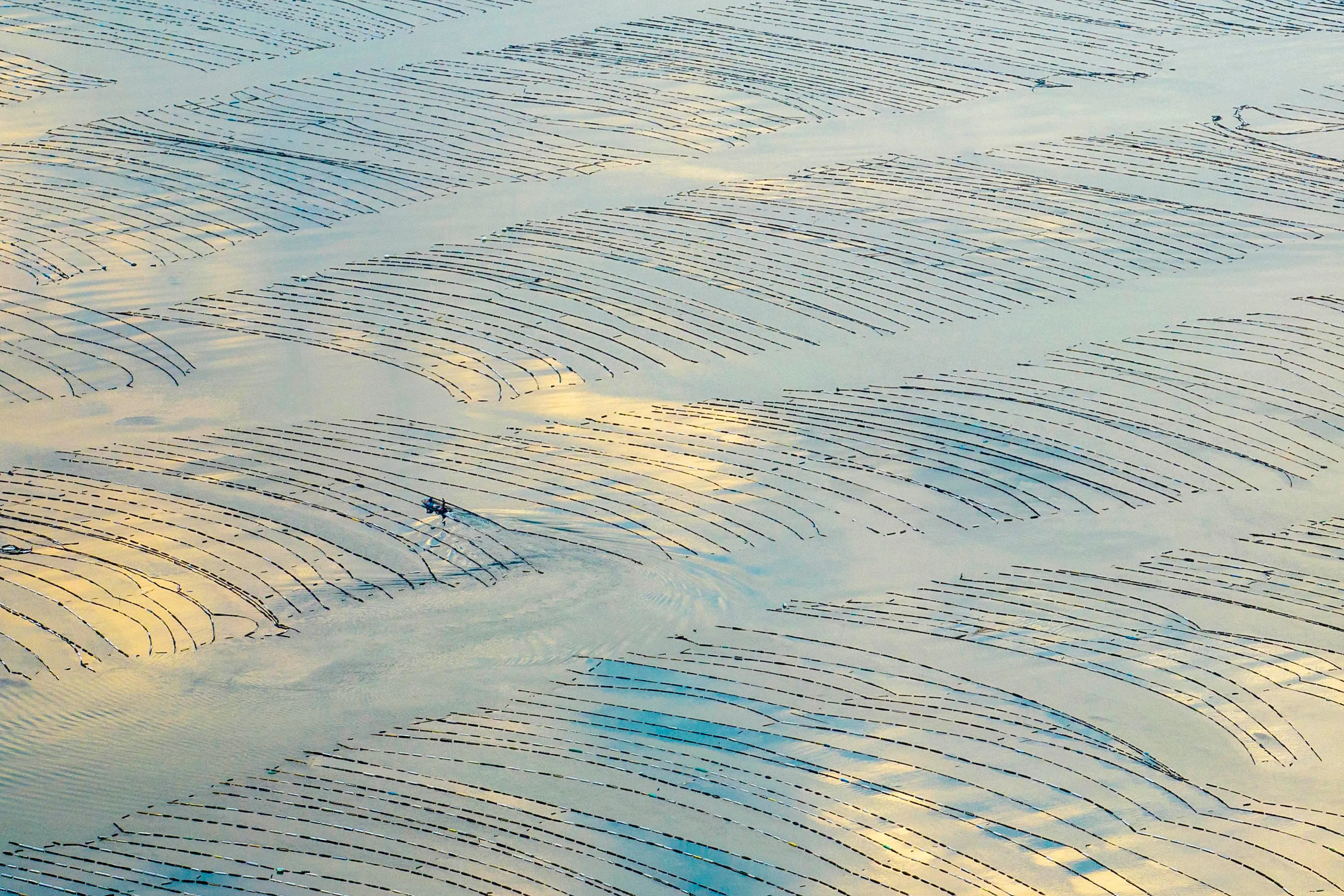 In this photo taken on August 23, 2023, oyster farmers maneuver their boat at an oyster farm at Qiangjiao town in Ningbo, in China's eastern Zhejiang Province. (Photo by AFP Photo/China Stringer Network)