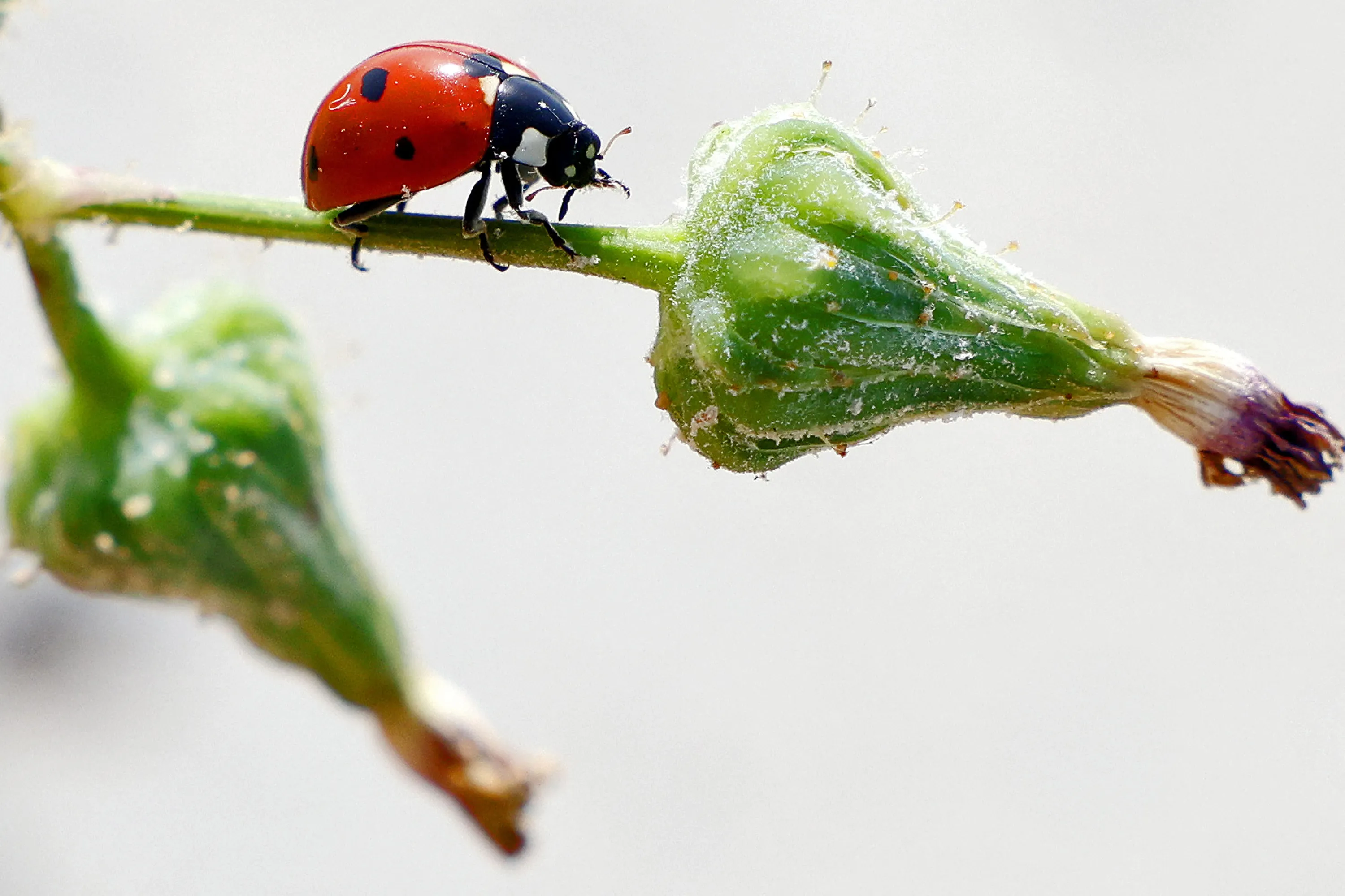 A ladybug lies on the stem of a blooming flower at a park in Kuwait City on April 6, 2023. (Photo by Yasser Al-Zayyat/AFP Photo)