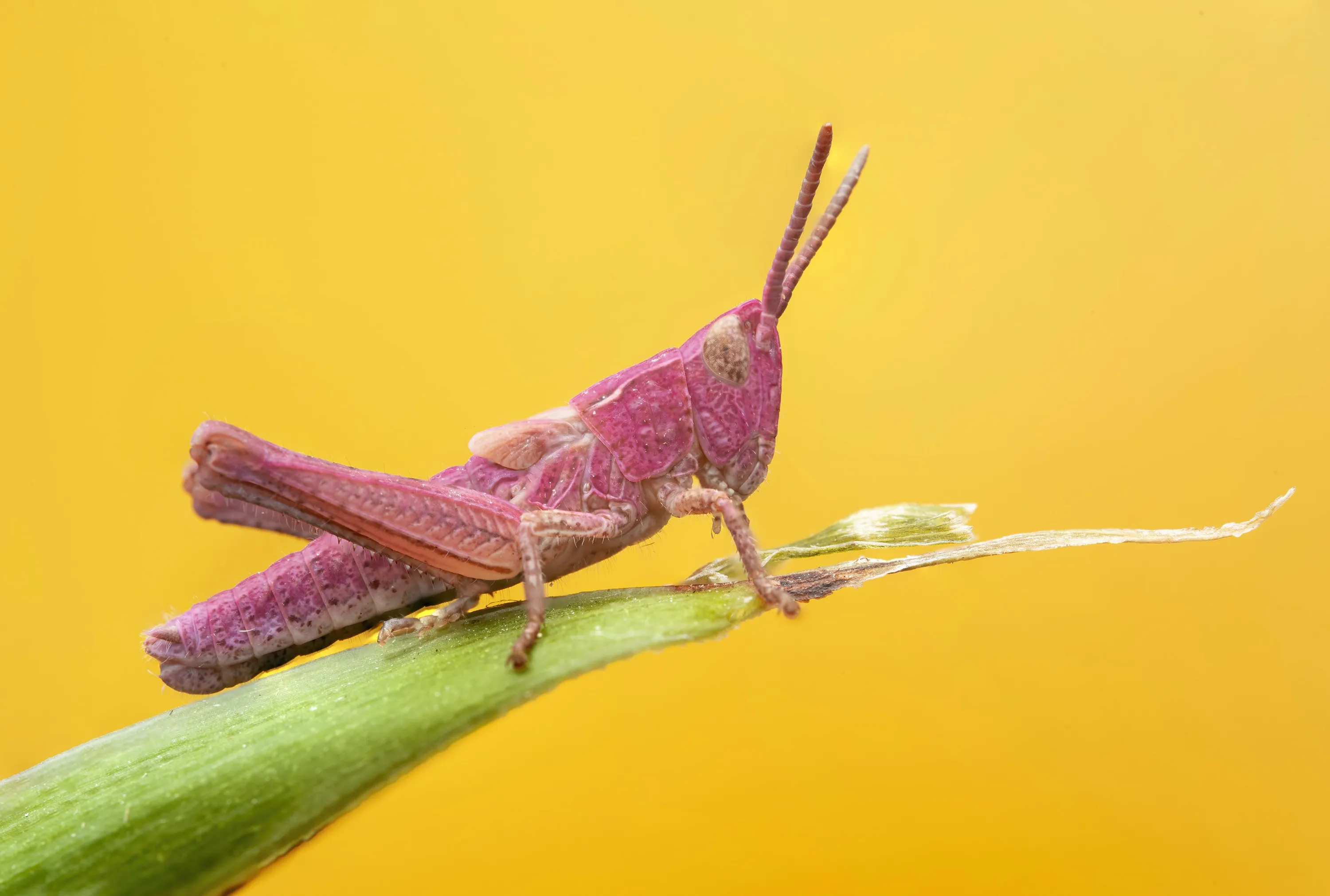 A pink grasshopper is spotted at the Messingham Sand Quarry in Scunthorpe, Lincolnshire, UK in the second decade of July 2023. The dazzling creature is incredibly rare, with experts estimating that a person has a chance of about 1 per cent of seeing one in their lifetime. (Photo by Calvin Taylor Lee/Animal News Agency)