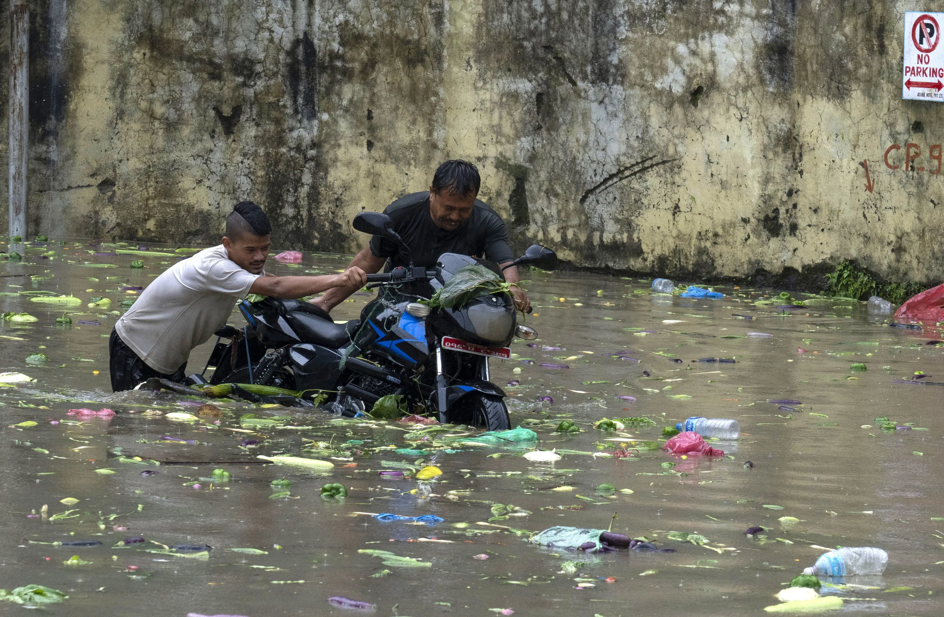 Two men push a motorcycle through flood waters after heavy monsoon rains flooded a vegetable market in Kathmandu, Nepal, Tuesday, August 8, 2023. (Photo by Niranjan Shrestha/AP Photo)