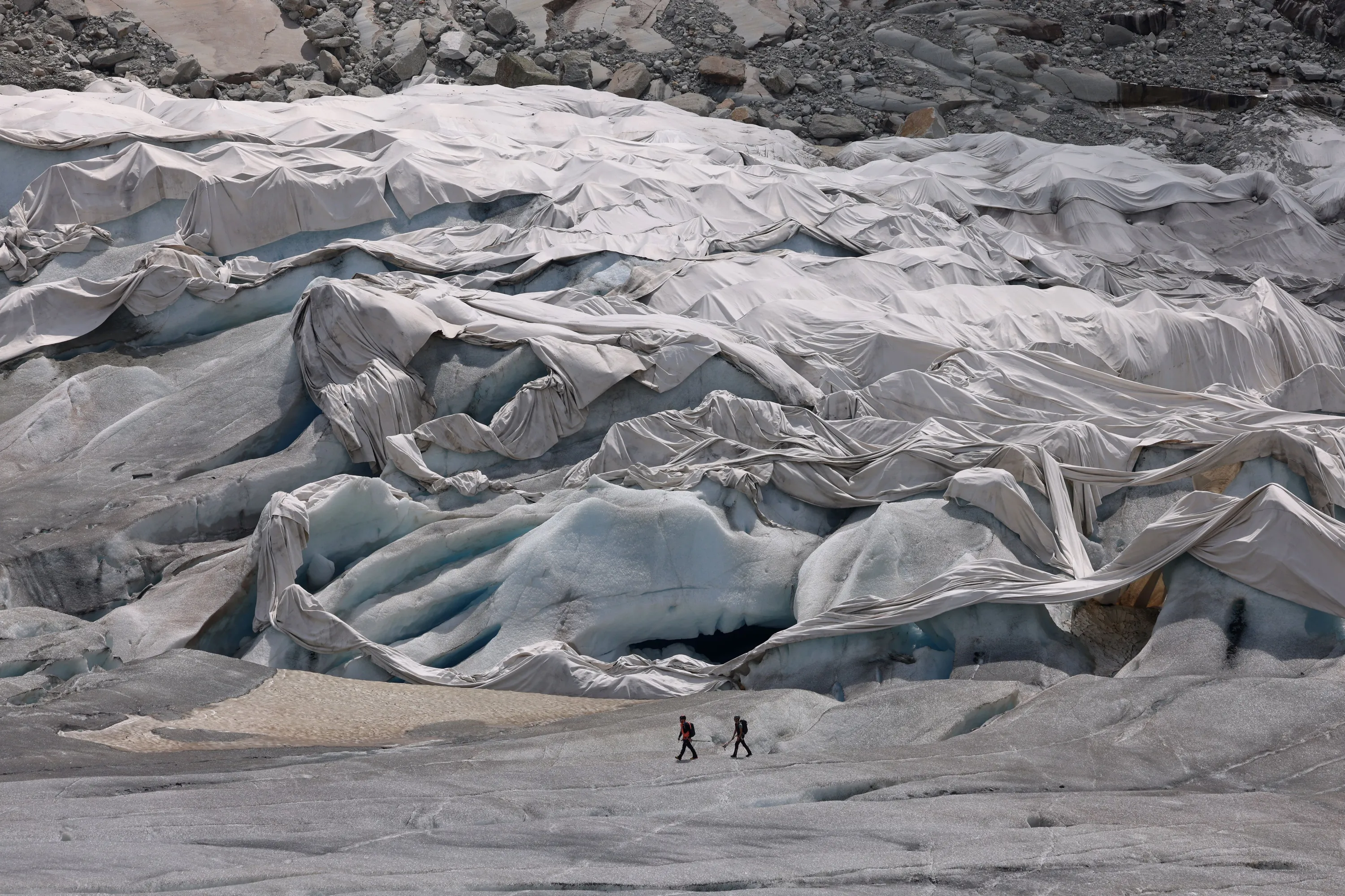 Alpinists hiking on the receding Rhone glacier walk past a portion at the very bottom of the glacier that is covered in reflective tarp on June 20, 2022 near Gletsch, Switzerland. The tarps, which are designed to reflect away the sun’s rays and reduce melting, cover a hewn ice grotto that is an annual tourist attraction. This summer is likely to be especially brutal for Switzerland’s glaciers. Normally in mid-June, the glaciers would still be covered in snow that protects them from the sun, though because very little snow fell this year, the glaciers are already exposed and melting rapidly under conditions that are more typical for late July or August. Matthias Huss, a glaciologist with ETH Zurich university and head of the Swiss glacier monitoring network, and his colleagues are studying approximately 20 glaciers, including the Rhone glacier, across Switzerland to observe the effects of global warming. All of the glaciers are melting, and he predicts that if we do not meet global climate goals Switzerland’s glaciers will be mostly gone by 2100. The Rhone glacier has lost an average of five meters per year in vertical thickness over the last ten years. (Photo by Sean Gallup/Getty Images)