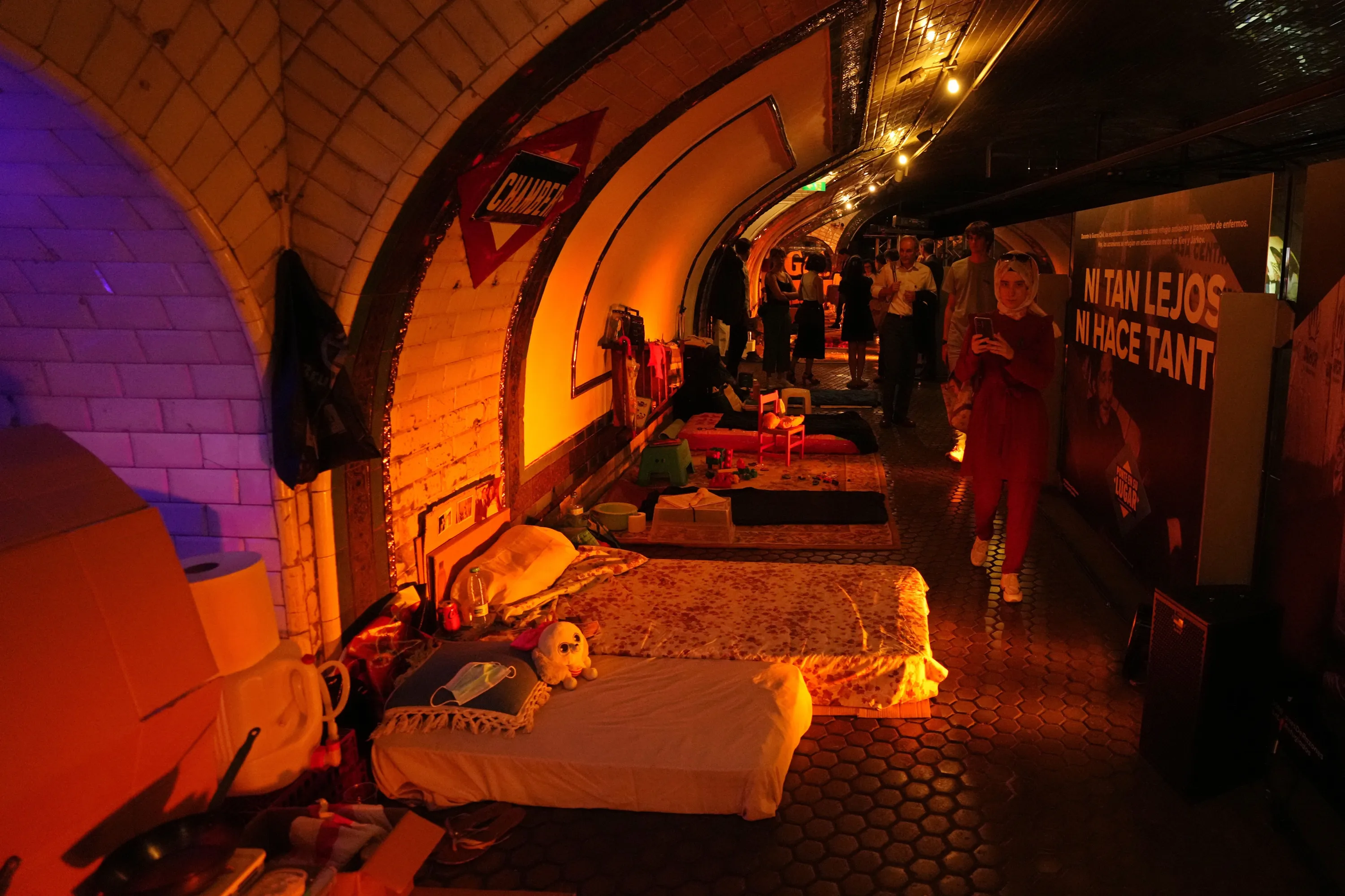 Members of the public visit the old disused Chamberi subway station on Line 1, converted into a symbolic air-raid shelter to mark World Refugee Day in Madrid, Spain, Monday, June 20, 2022. (Photo by Paul White/AP Photo)