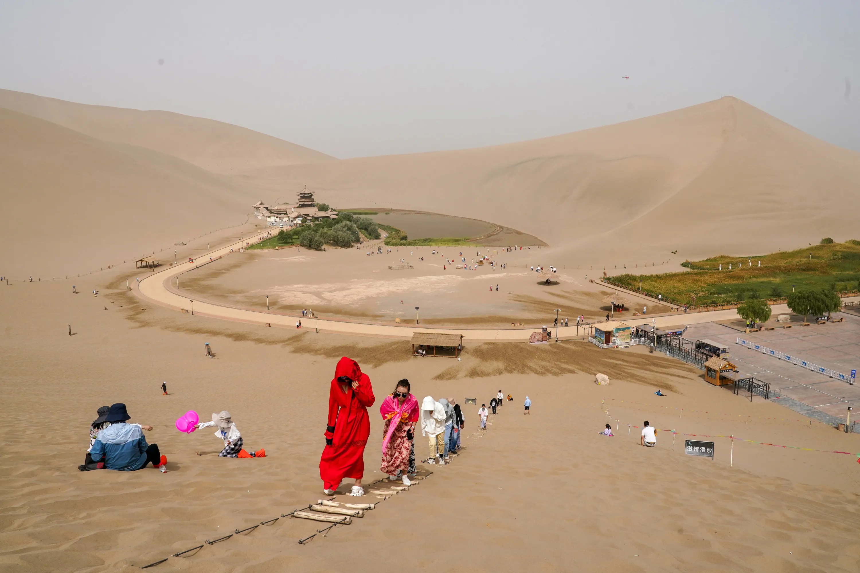 Tourists visit Mingsha Mountain and Crescent Spring scenic spot on August 29, 2023 in Dunhuang, Gansu Province of China. (Photo by Mao Jianjun/China News Service/VCG via Getty Images)