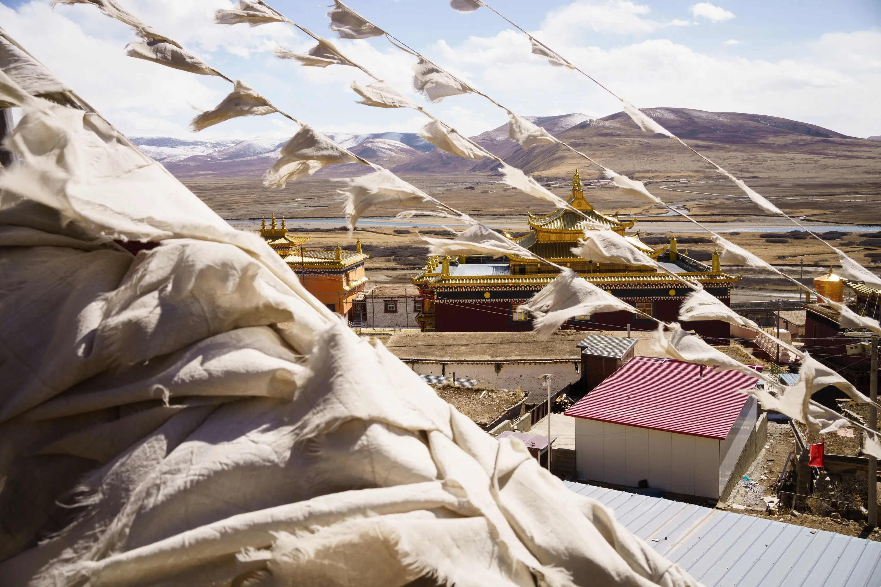 A monastary surrounded by mountains shines in the noon sun as weathered prayer flags flap in the breeze in Shiqu, China on March 25, 2023. (Photo by Jake Homovich/Anadolu Agency via Getty Images)