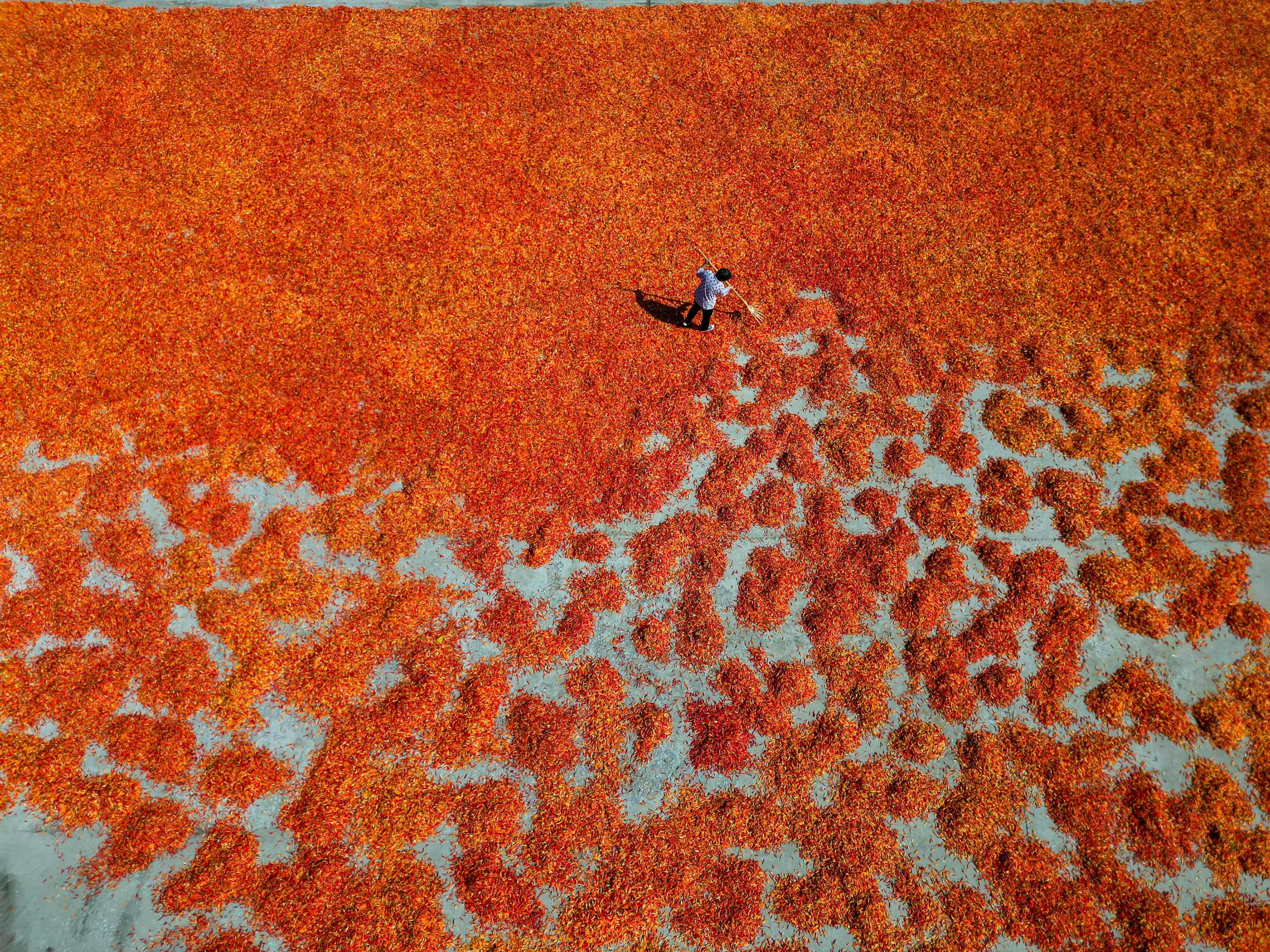 Aerial view of a villager spreading red chilies for air-drying on August 29, 2023 in Bozhou, Anhui Province of China. (Photo by Yang Zhongqin/VCG via Getty Images)