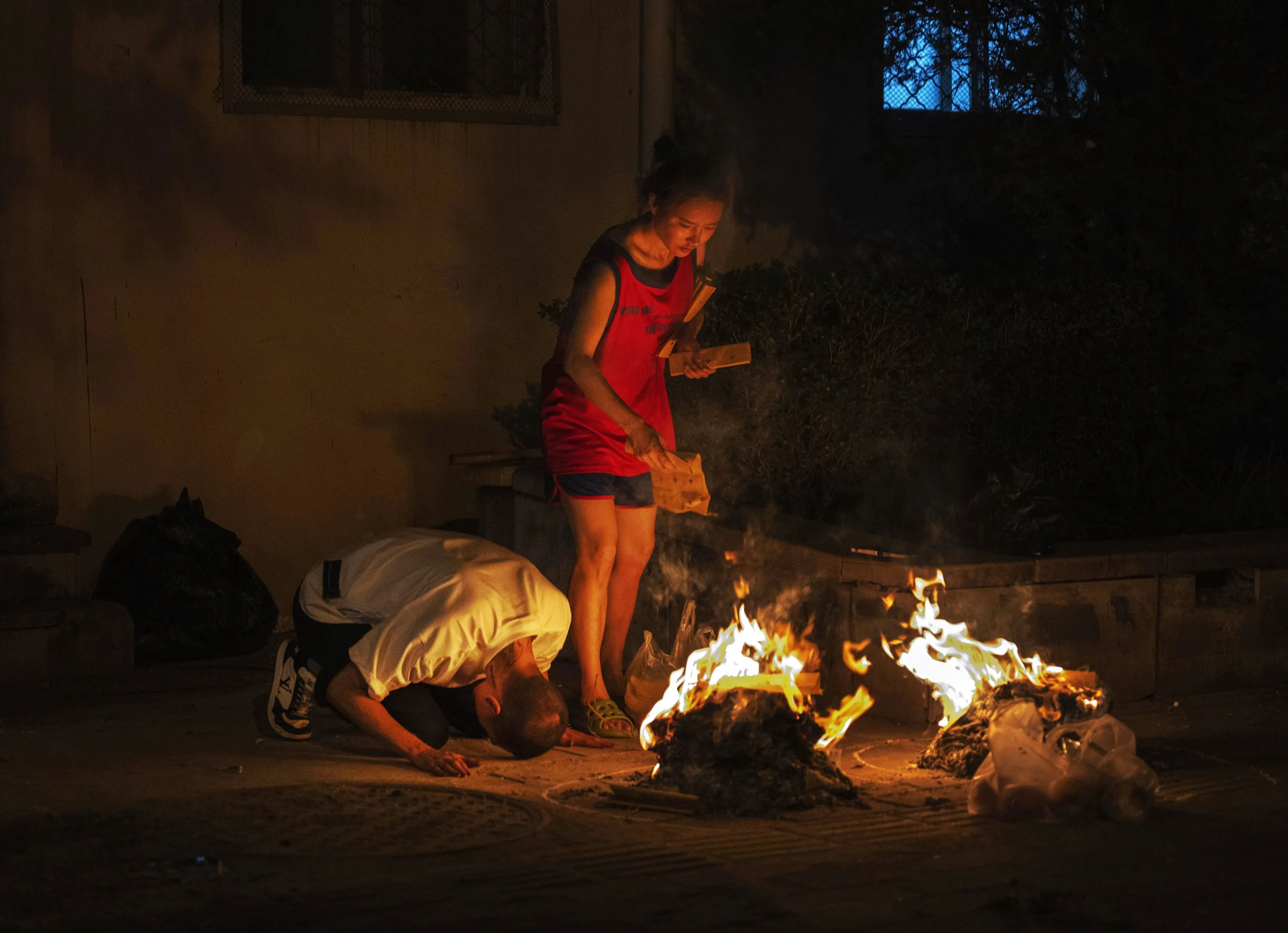 A man kneels and prays as a woman burns fake paper money and other offerings in memory of relatives who have died during the Hungry Ghost Festival, also known as the Zhongyuan Festival on a street on August 30, 2023 in Beijing, China. The Hungry Ghost Festival, which is marked in China, Singapore, Malaysia and other countries, is a day to honour deceased ancestors. It is traditionally believed that on the first day of the festival month the Gates of Hell open and release the spirits of the dead. (Photo by Kevin Frayer/Getty Images)