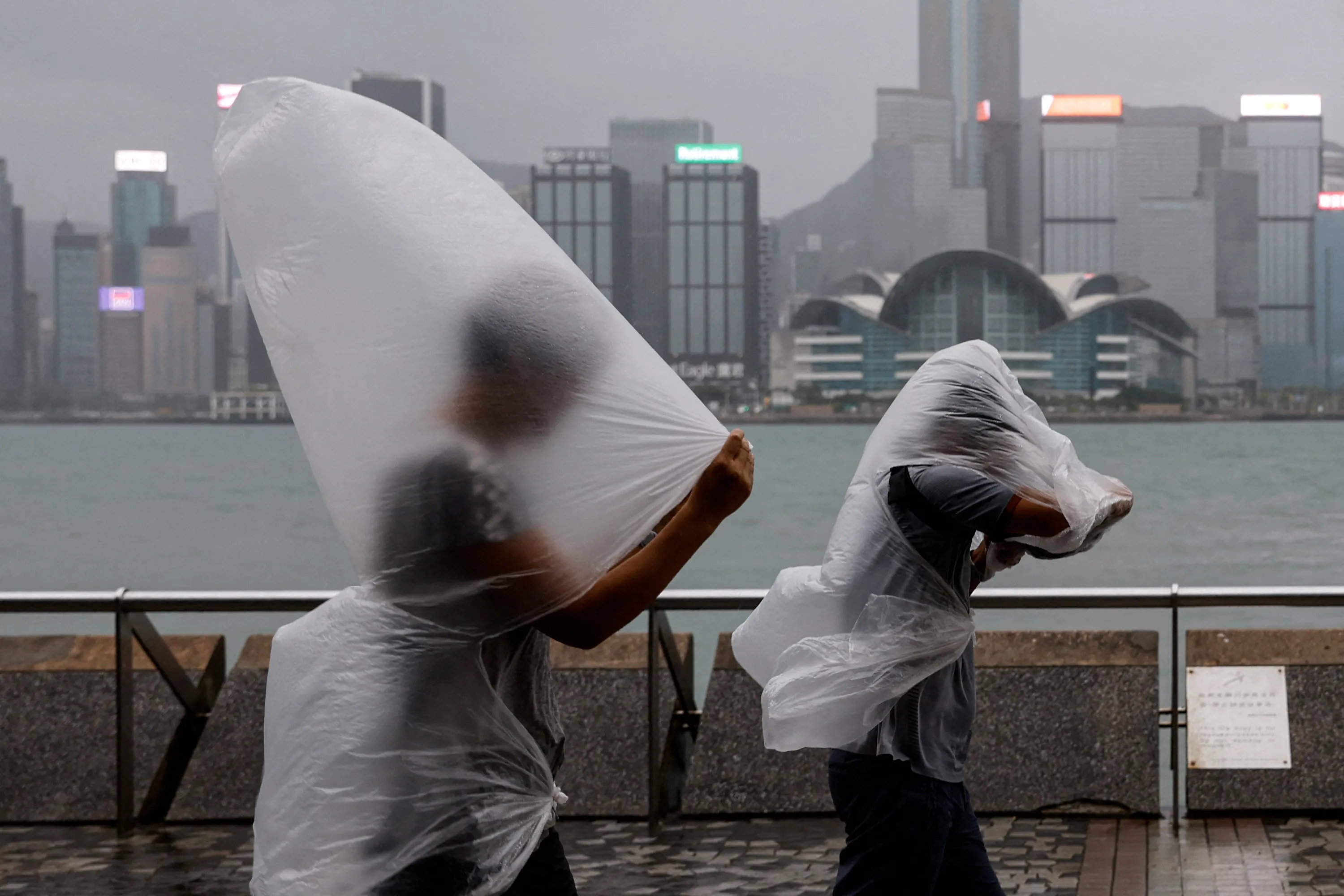 People brave strong winds as Super Typhoon Saola approaches, in Hong Kong, China on September 1, 2023. (Photo by Tyrone Siu/Reuters)