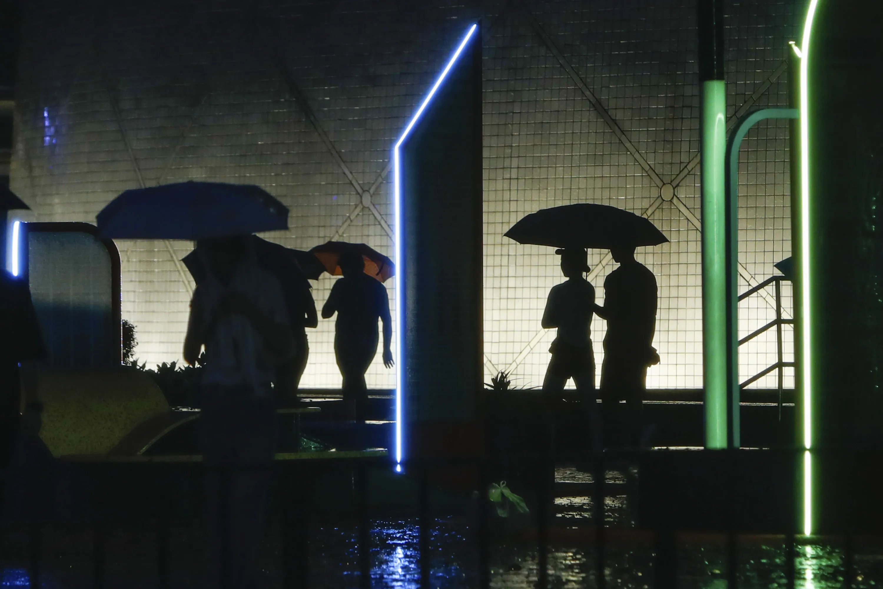 Residents walk with umbrellas as typhoon Saola hits Hong Kong, on Friday, September 1, 2023. Most of Hong Kong and other parts of southern China ground to a near standstill Friday with classes and flights canceled as powerful Typhoon Saola approached. (Phoot by Daniel Ceng/AP Photo)