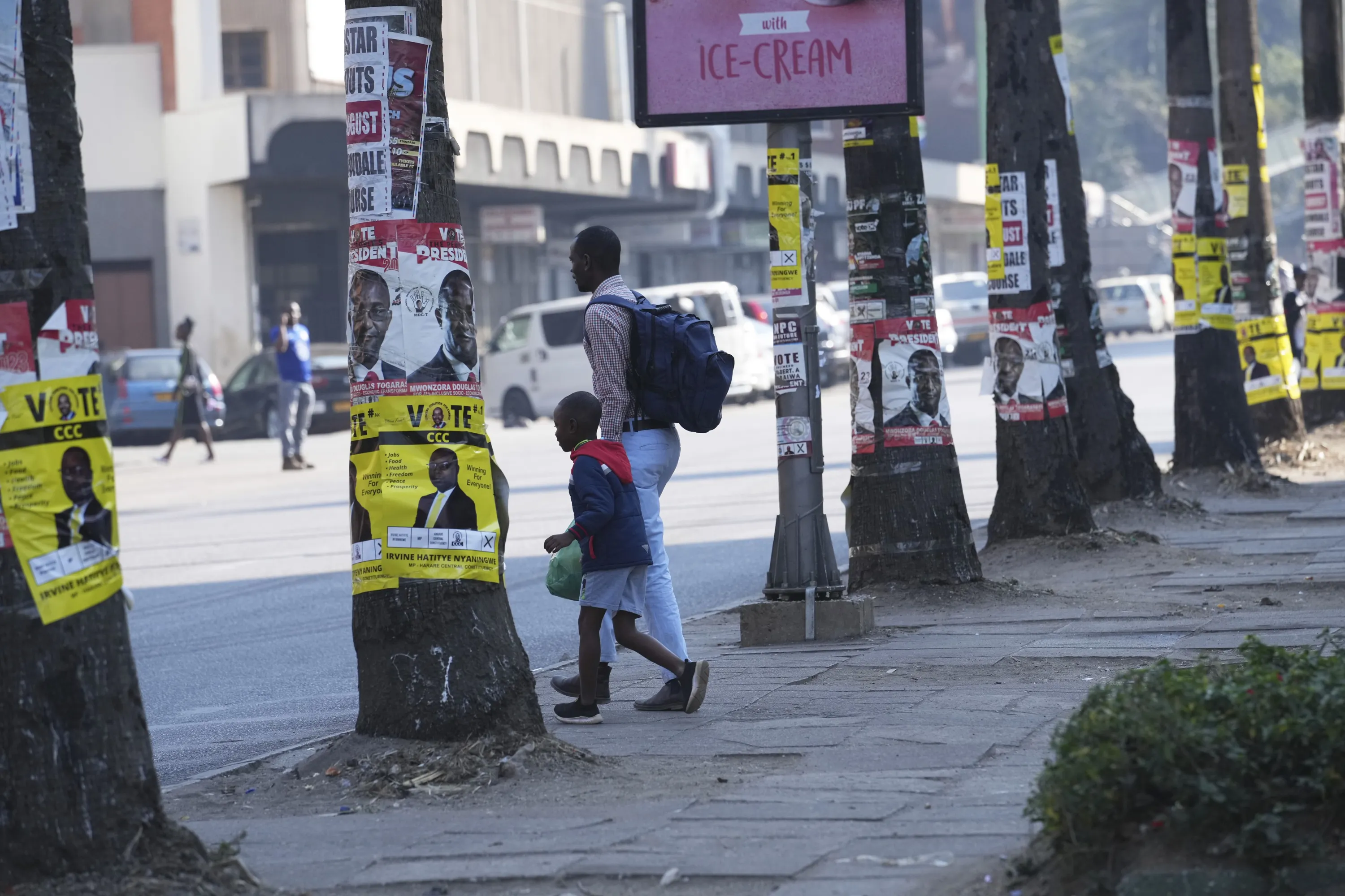 A man and a child walk past trees plastered with campaign posters on the streets of Harare, Sunday, August 20 2023. The upcoming general election in Zimbabwe is crucial to determining the future of a southern African nation endowed with vast mineral resources and rich agricultural land. But for many in the educated but underemployed population, the daily grind to put food on the table inhibits interest in politics. (Photo by Tsvangirayi Mukwazhi/AP Photo)