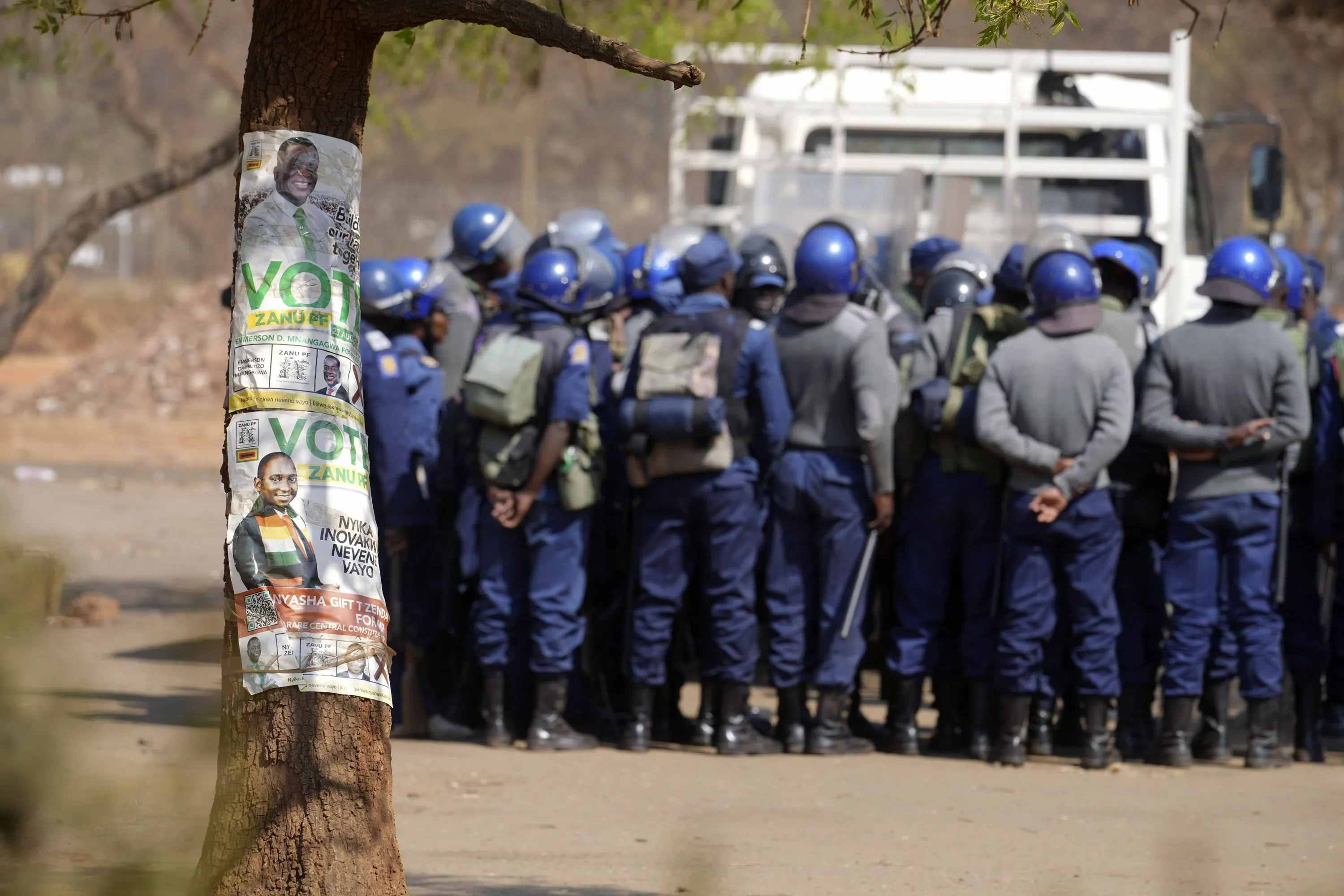 Armed riot police prepare to be deployed on the streets of Harare, Zimbabwe, Friday, August 25, 2023. Hordes of police officers armed with batons, teargas canisters and some with guns were seen next to the result centre as Zimbabweans anxiously waited for the outcome of general elections after polls closed on Thursday and authorities tightened security around the results centre. (Photo by Tsvangirayi Mukwazhi/AP Photo)