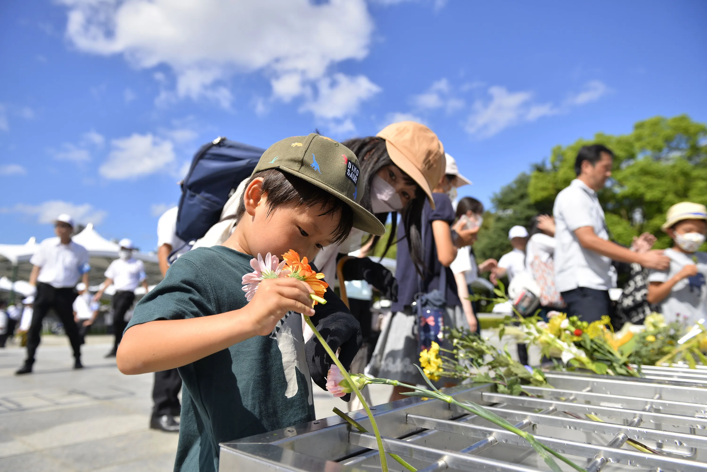 A mother and her child lay a bouquet of flower in front of the cenotaph for the victims of the world's first atomic bombing at the Peace Memorial Park after a ceremony to pay tribute for the atomic bomb victims in Hiroshima, Japan, on August 06, 2023. Japan commemorates the 78th anniversary of the atomic bomb tragedy in Hiroshima. During World War II, on August 6, 1945, the first atomic bomb in the world history was dropped on Hiroshima by the USA, which caused the instant death of an estimated 70,000 people and the death of thousands from the effects of radiation in the following years. (Photo by David Mareuil/Anadolu Agency via Getty Images)