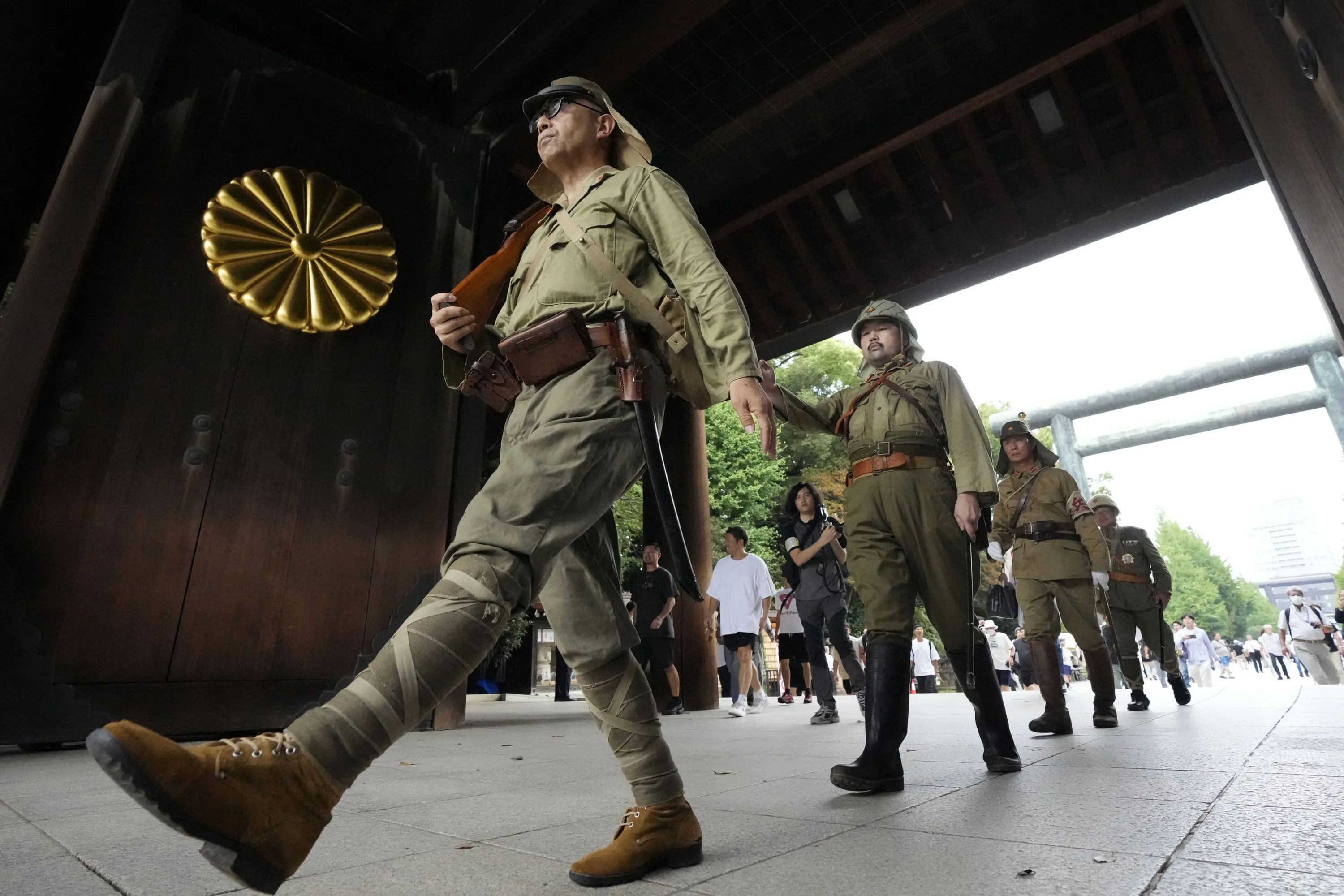Visitors in Japanese Imperial army costume enter the Yasukuni Shrine, which honors Japan's war dead, Tuesday, August 15, 2023, in Tokyo, Japan. Japan holds annual memorial service for the war dead as the country marks the 78th anniversary of its defeat in the World War II. (Photo by Eugene Hoshiko/AP Photo)