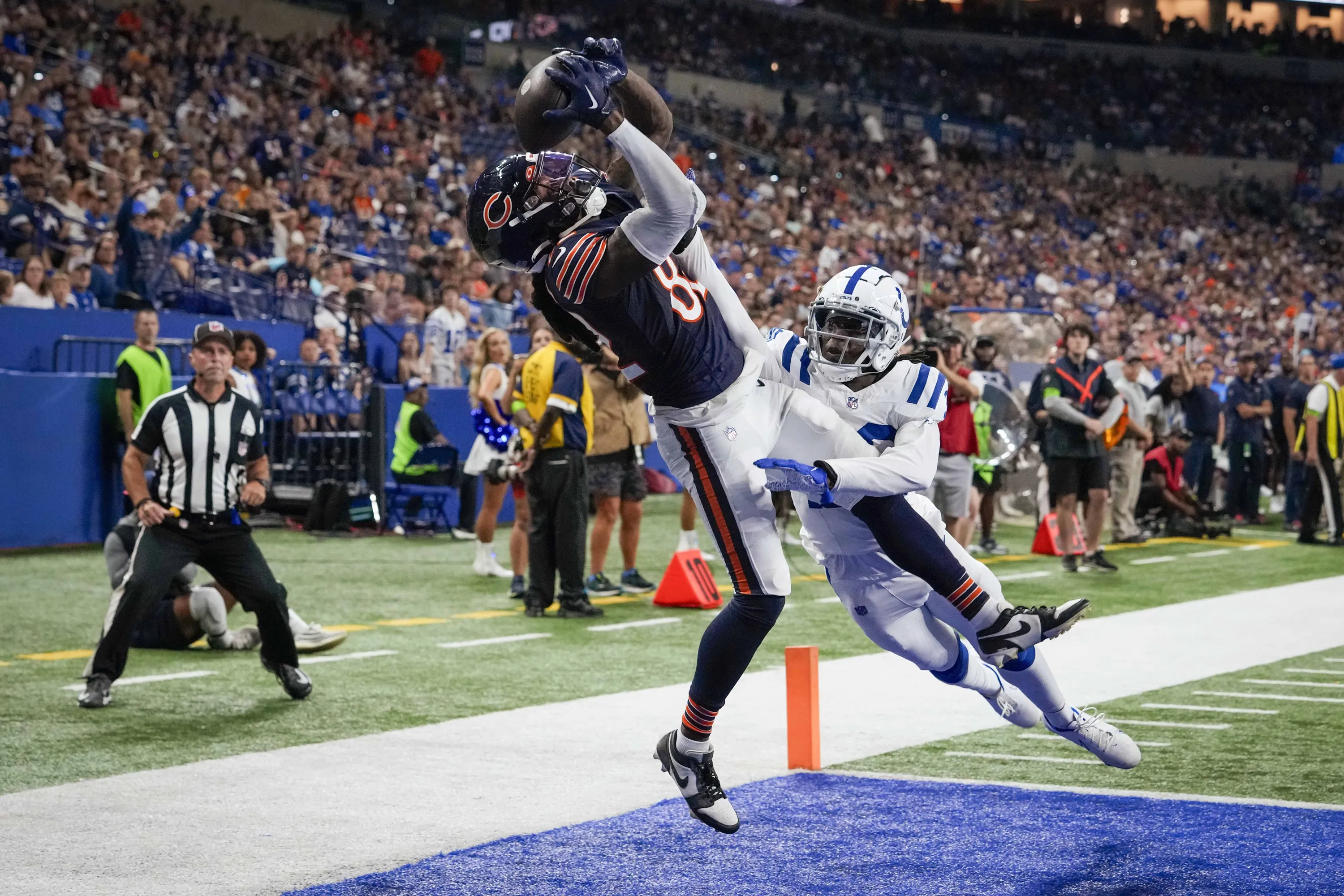 Chicago Bears wide receiver Daurice Fountain, left, makes a touchdown reception in front of Indianapolis Colts cornerback Darius Rush during the second half of an NFL preseason football game in Indianapolis, Saturday, August 19, 2023. (Photo by Michael Conroy/AP Photo)