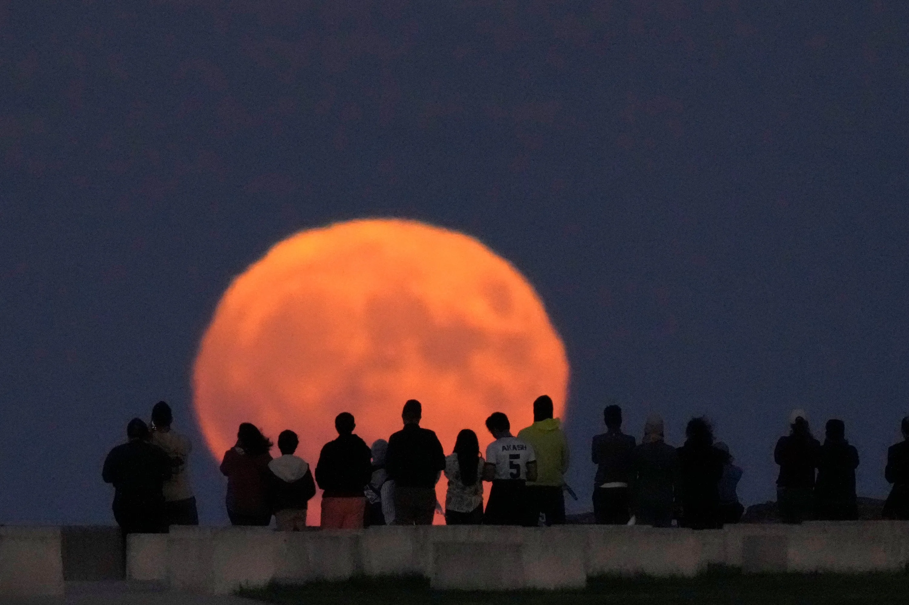 A rare blue supermoon rises over Lake Michigan as spectators watch from Chicago's 31st Street beach Wednesday, August 30, 2023. (Photo by Charles Rex Arbogast/AP Photo)