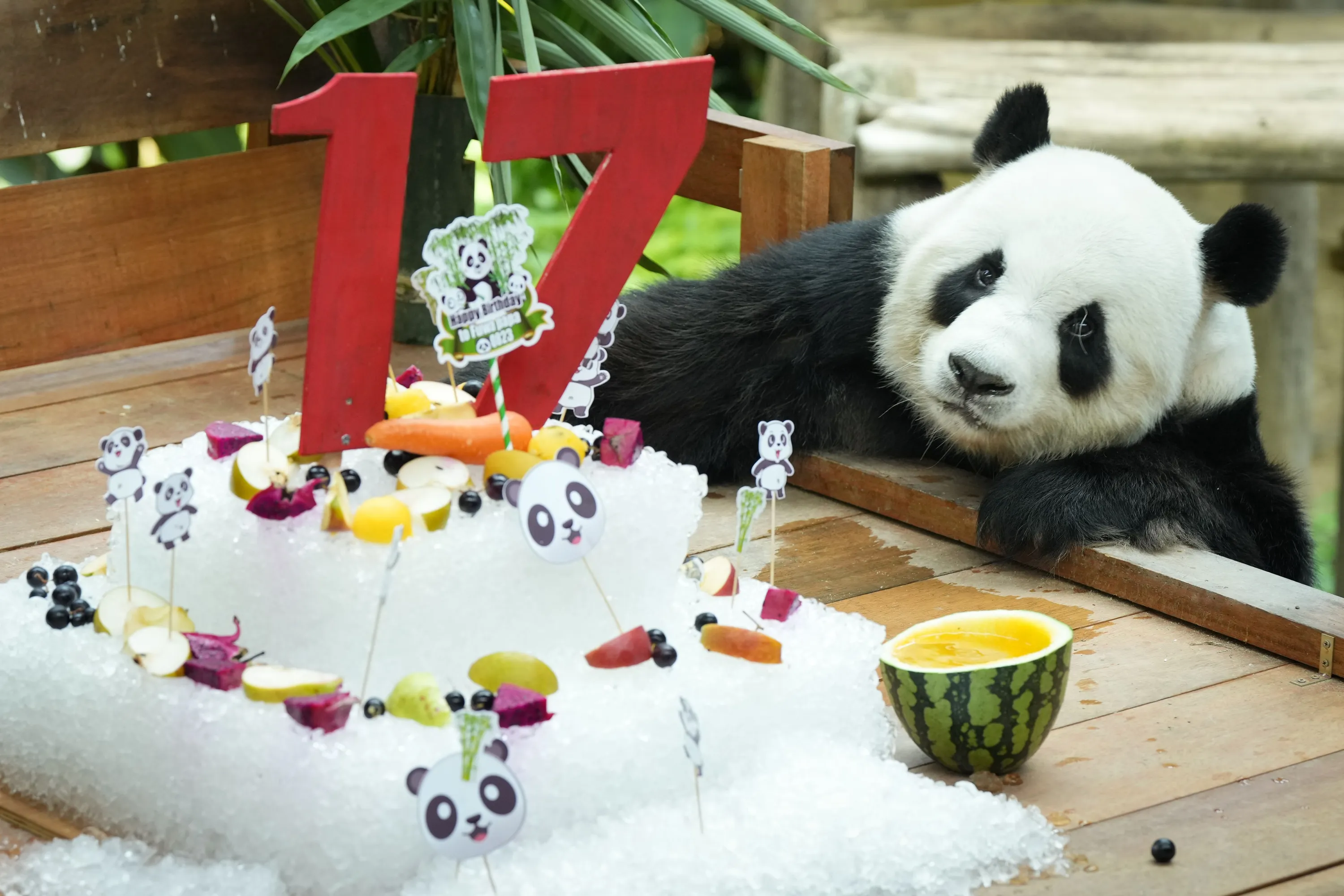 Giant male panda Xing Xing checks his ice cake on its 17th birthday at the National Zoo in Kuala Lumpur, Malaysia Wednesday, August 23, 2023. (Photo by Vincent Thian/AP Photo)