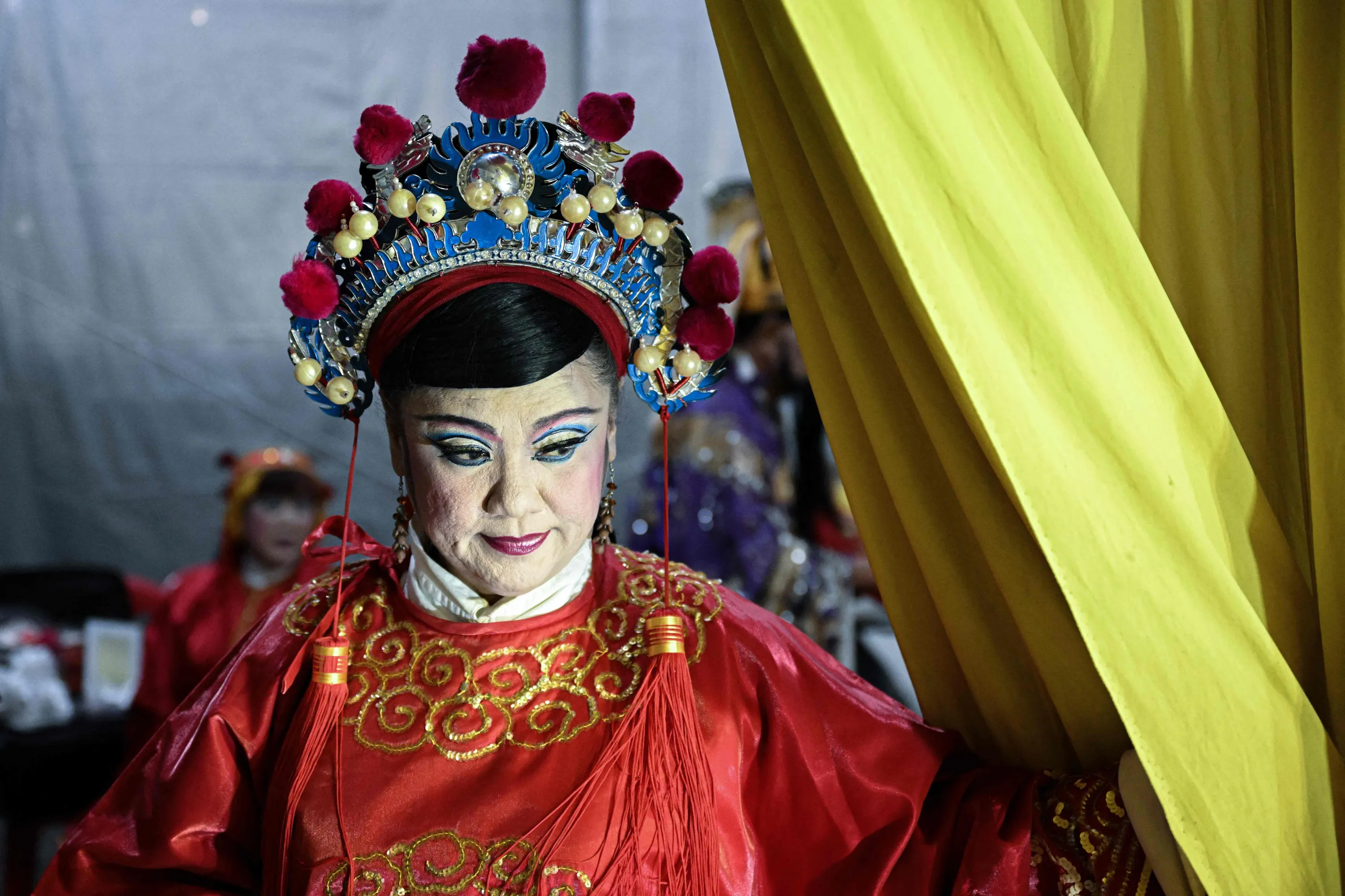 This picture taken on August 24, 2023 shows an ethnic Malaysian-Chinese artist preparing to perform a Chinese opera in front of empty seats believed to be seated by dead ancestors during the Hungry Ghost Festival in Kajang, Malaysia's Selangor state. The festival, celebrated in the seventh lunar month of the lunar new year calendar among communities in southern China, Malaysia, Singapore, Hong Kong and Taiwan, marks the belief that the 'Gates of Hell' are opened to let out the hungry ghosts who then wander in the land of the living while foraging for food. (Photo by Mohd Rasfan/AFP Photo)