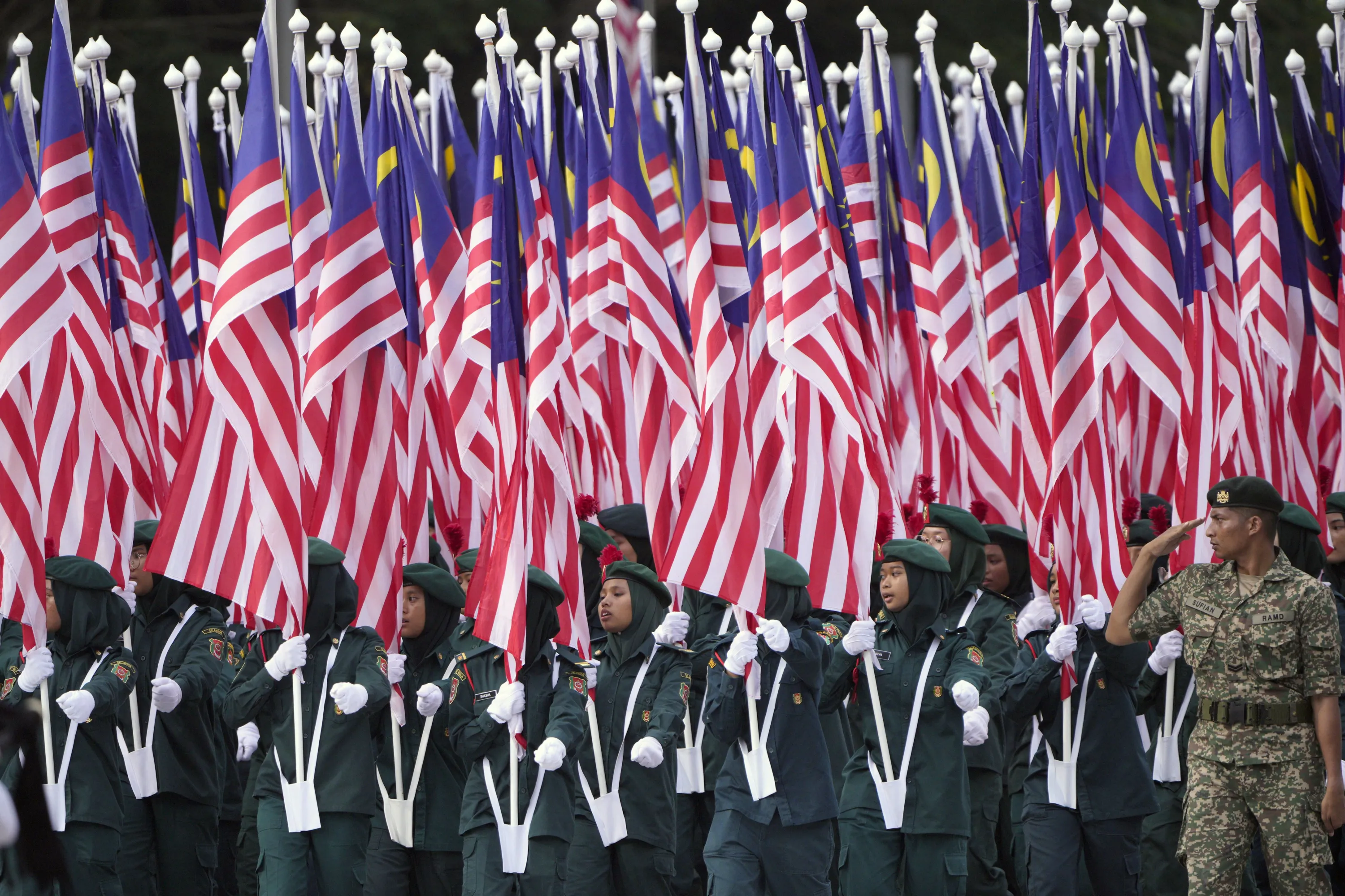 Members of Malaysian school-based government youth organization KRS hold their national flags during the National Day parade in Putrajaya, Malaysia, Thursday, August 31, 2023. Prime Minister Anwar Ibrahim urged Malaysians to unite and reject racial and religious bigotry, as the country marked its 66th year of freedom from British rule on Thursday with fireworks and a street parade. (Photo by Vincent Thian/AP Photo)