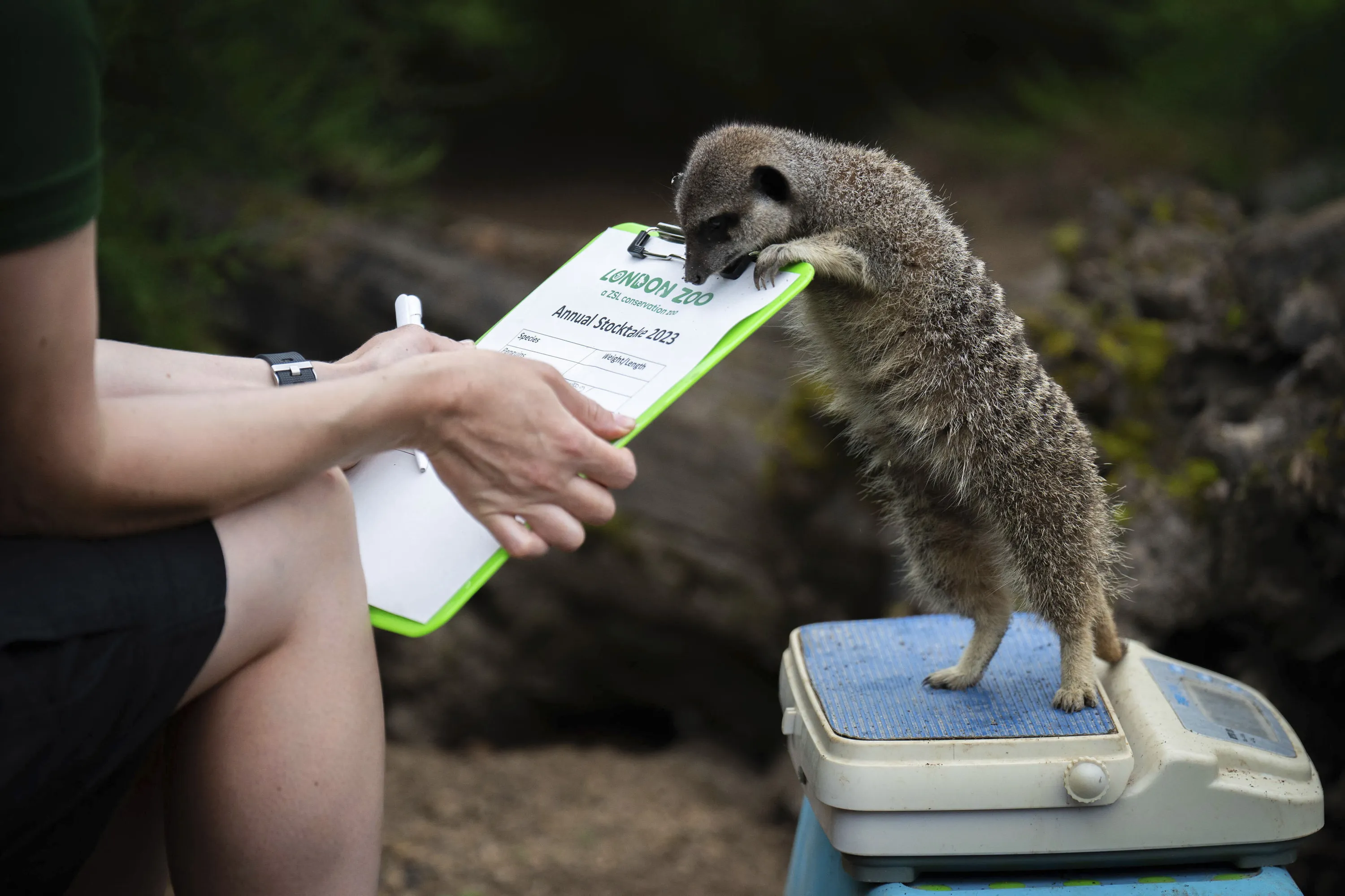 A meerkat is weighed during London Zoo's Annual Weigh In, in London, Thursday, August 24, 2023. The Annual Weigh In is a chance for keepers at the conservation zoo to make sure the information they've recorded is up-to-date and accurate, with each measurement then added to the Zoological Information Management System (ZIMS), a database shared with zoos all over the world that helps zookeepers to compare important information on thousands of threatened species. (Photo by James Manning/AP Photo)