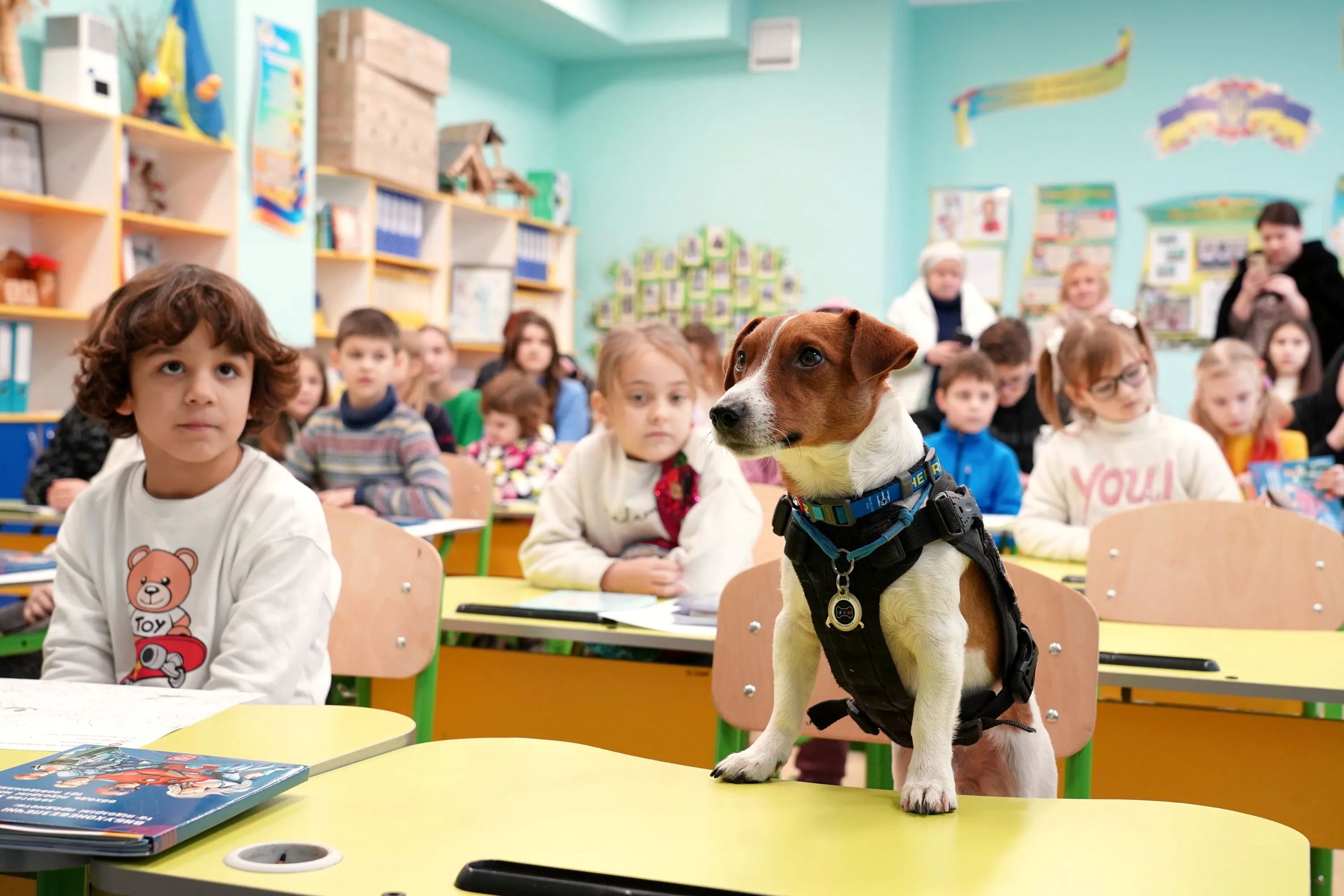 Patron the UNICEF AmbassaDOG in Ukraine on August 24, 2023. Patron is the first dog in history to have been awarded the title of Goodwill AmbassaDOG by UNICEF. Patron the Dog, a Jack Russell Terrier and renowned sniffer dog, has been working with UNICEF since November 2022 and regularly visits schoolchildren to teach them about mine-safety whilst providing much-needed mental health and wellbeing support. (Photo by Kulakovskyy/Boyko/Skyba/UNICEF)