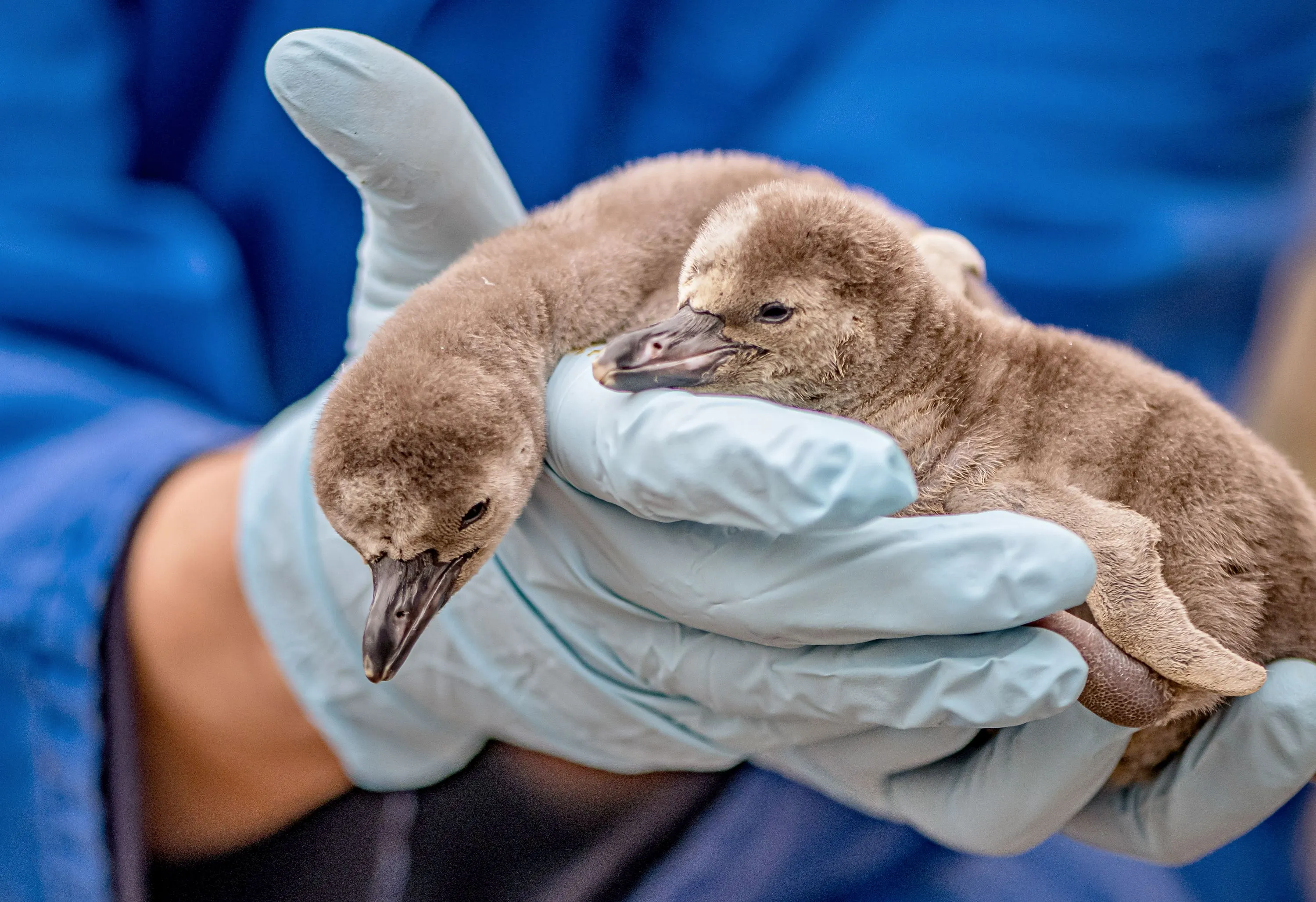 Undated handout photo issued by Chester Zoo of zookeeper Zoe Sweetman with two Humboldt penguin chicks, soon after hatching, named after Wrexham AFC's Hollywood owners at the zoo in Upton-by-Chester. Issue date: Friday, August 25, 2023. The penguins, born in April, named Ryan, after Deadpool star Ryan Reynolds, and Rob in tribute to TV comedy actor Rob McElhenney can now showcase their species' “excellent” swimming and diving skills after shedding their baby feathers and leaving the nest. (Photo by Chester Zoo/PA Wire)