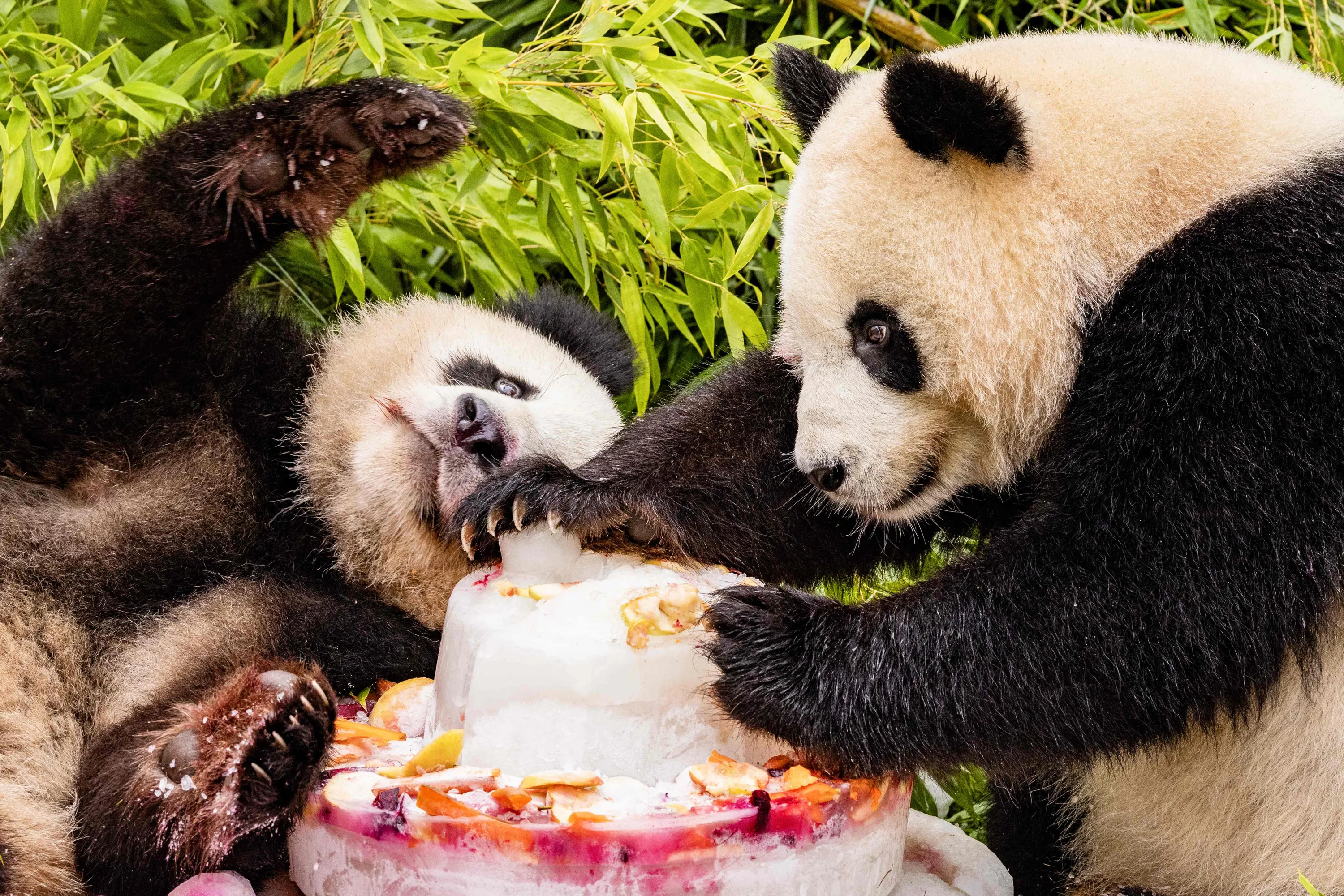 Panda twin cubs Pit and Paule celebrate their 4th birthday with an ice cake made of fruit and vegetables at the Zoologischer Garten zoo in Berlin on August 31, 2023. On loan from China, the cub's parents Meng Meng and male panda Jiao Qing arrived in Berlin in June 2017. While their cubs, Paule and Pit, are born in Berlin, they remain Chinese and must be returned to China after they have been weaned. (Photo by Odd Andersen/AFP Photo)