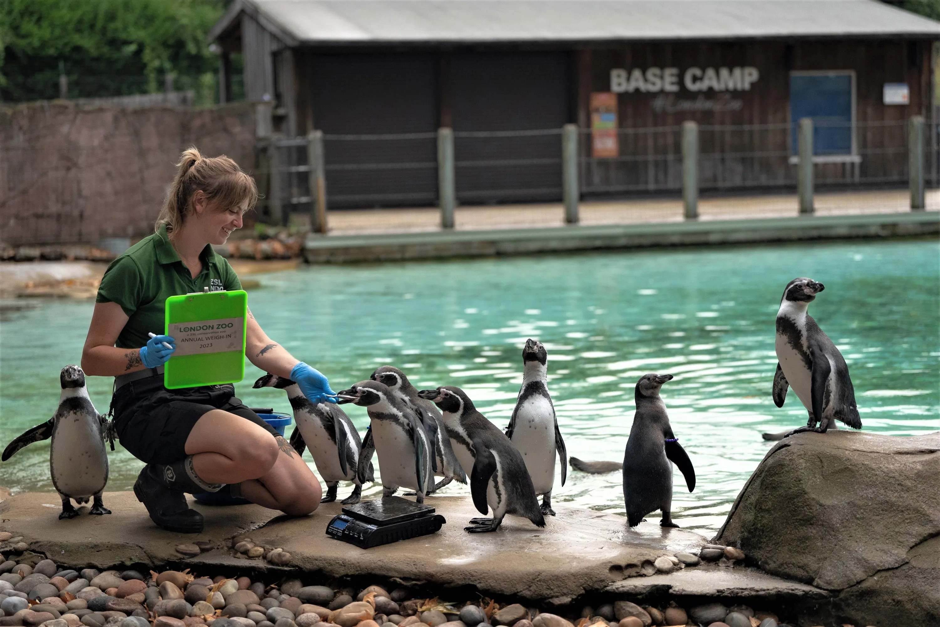 A keeper measures penguins at London Zoo on August 24, 2023 in London, England. The annual weigh-in allows zookeepers and veterinarians to record vital statistics and track the health and wellbeing of the animals at London Zoo. (Photo by Mark Case/Getty Images)