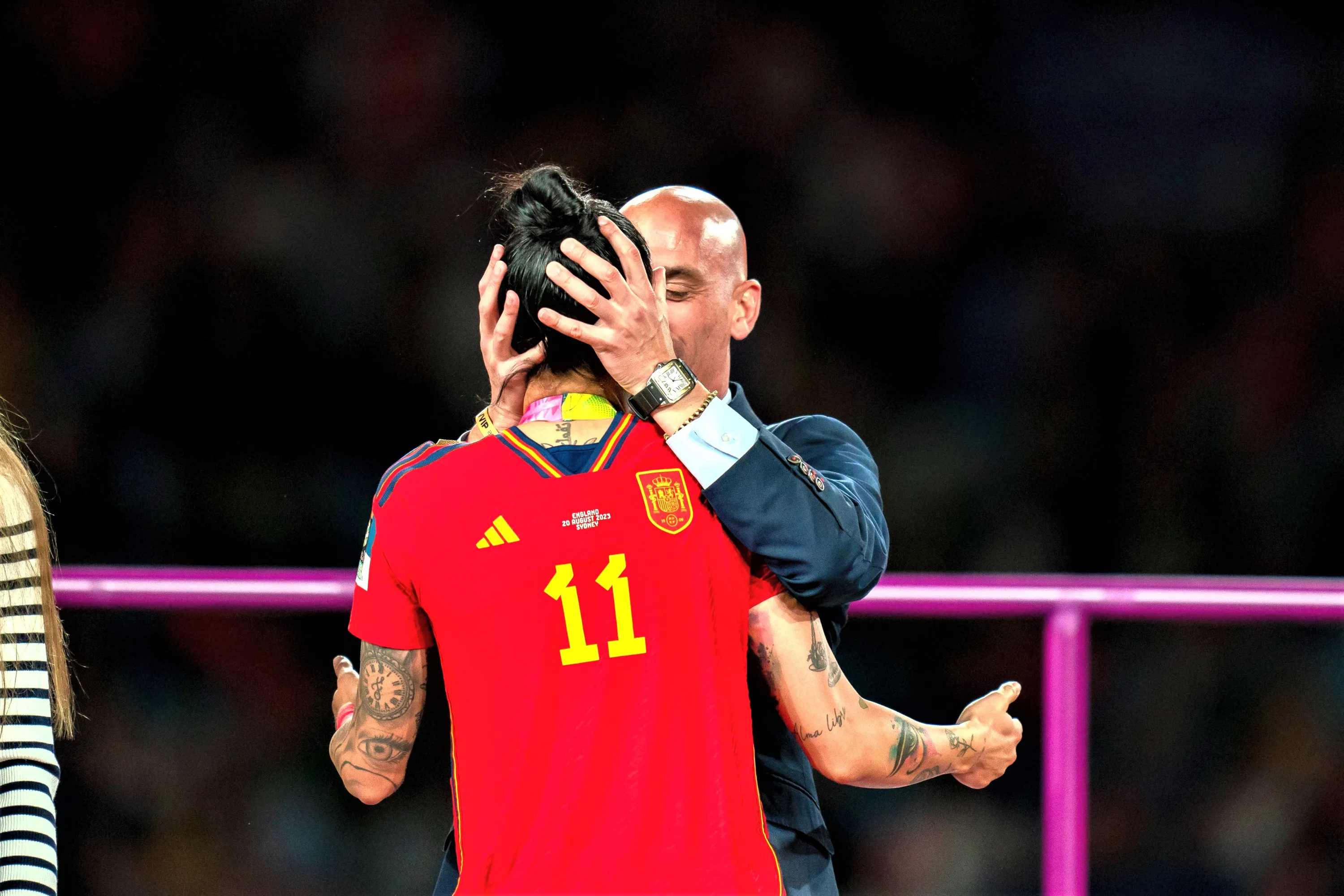 Luis Rubiales, the president of Spain’s football federation, kisses Jenni Hermoso on the lips in Sydney, Australia on August 20, 2023, after Spain defeated England 1-0 to win the Women’s World Cup in Sydney. Rubiales hit out at “false feminism” and a “social assassination” of his character as he vowed to stay on as head of Spain’s football federation amid fierce criticism and a Fifa investigation. (Photo by Noe Llamas/SPP/Rex Features/Shutterstock)