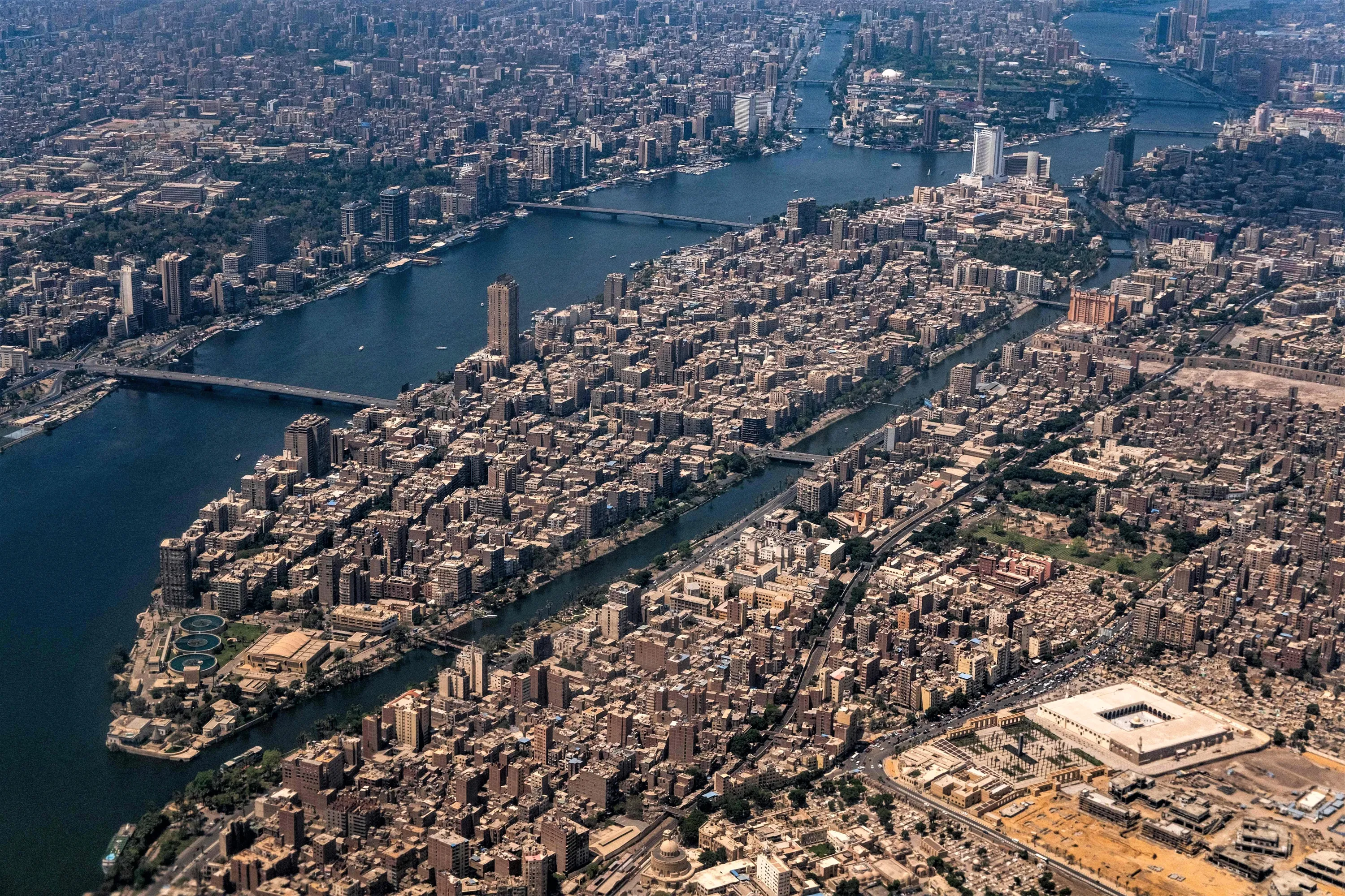 This aerial view taken on April 28, 2023 shows the historic Mosque of Amr ibn al-Aas (bottom R) in the Fustat and Coptic Cairo district and the Nile island district of Manial al-Roda (C), with Cairo's twin-city of Giza across the river (L). (Photo by Amir Makar/AFP Photo)