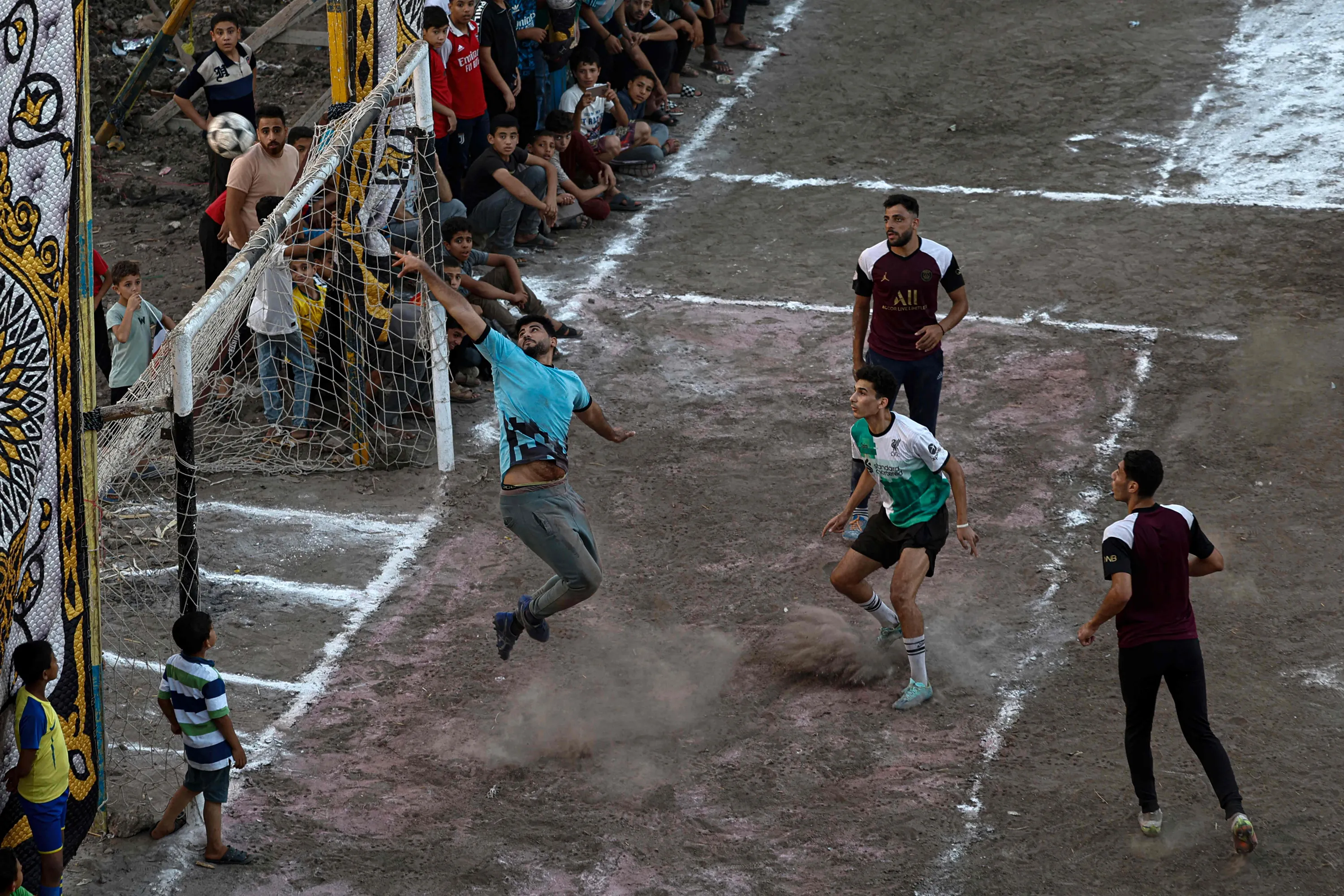 People watch the final football match of the tournament of 32 teams from Tanta, in the village of Damshit in the Nile Delta, some 135km (85 miles) north of Cairo on August 25, 2023. (Photo by Khaled Desouki/AFP Photo)