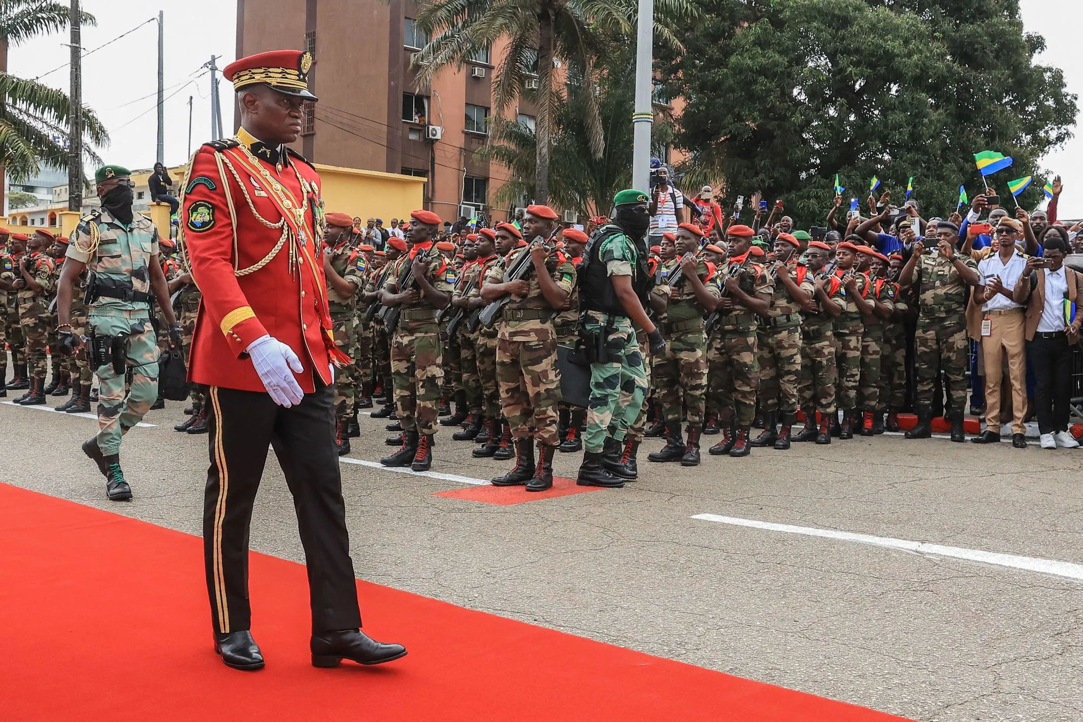 Gabon's new strongman General Brice Oligui Nguema (2nd L), who was inaugurated as Gabon's interim President, reviews the troops before the military parade, in Libreville on September 4, 2023. Gabon's coup leader vowed after being sworn in as interim president on September 4, 2023 to restore civilian rule through “free, transparent and credible elections” after a transition and amnesty prisoners of conscience. (Photo by AFP Photo/Stringer)