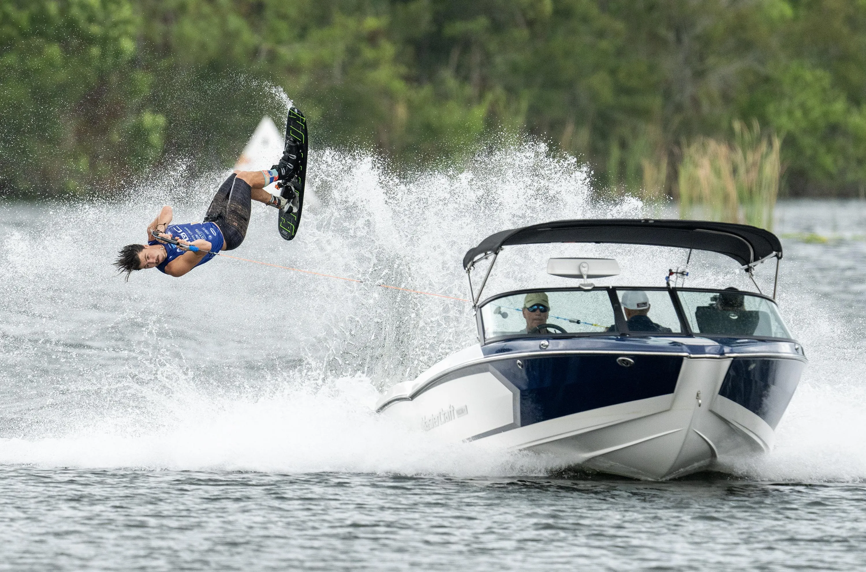 Joel Poland of Great Britain trick skis during the finals at the Florida Cup Water Ski Championships presented by World Water Skiers at Ski Fluid Training Centre on September, 2, 2023 in Polk City, Florida, United States. (Photo by Johnny Hayward/Getty Images)