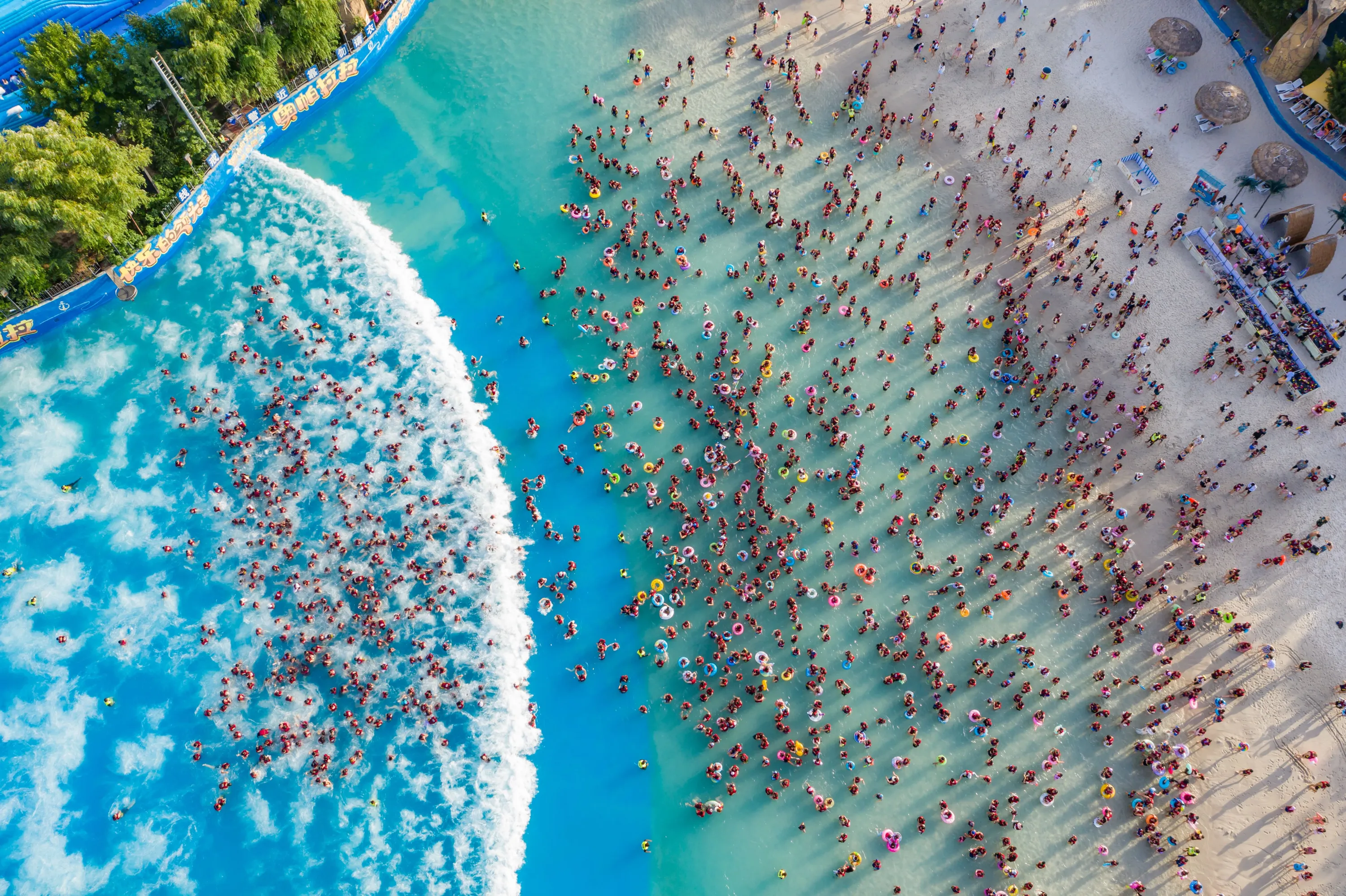 Aerial view of people cooling off at a water park on August 17, 2023 in Zhengzhou, Henan Province of China. (Photo by VCG/VCG via Getty Images)