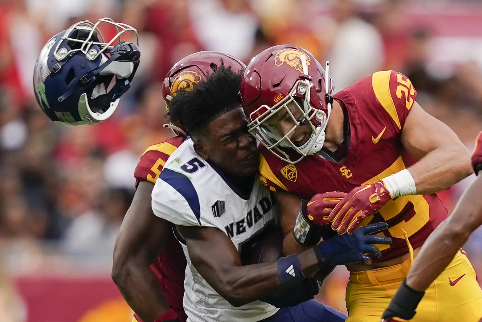 Nevada wide receiver Dalevon Campbell loses his helmet after being hit by Southern California linebacker Tackett Curtis during the first half of an NCAA college football game, in Los Angeles, Saturday, September 2, 2023. Upon review by officials, Curtis was ejected on a targeting penalty. (Photo by Ryan Sun/AP Photo)