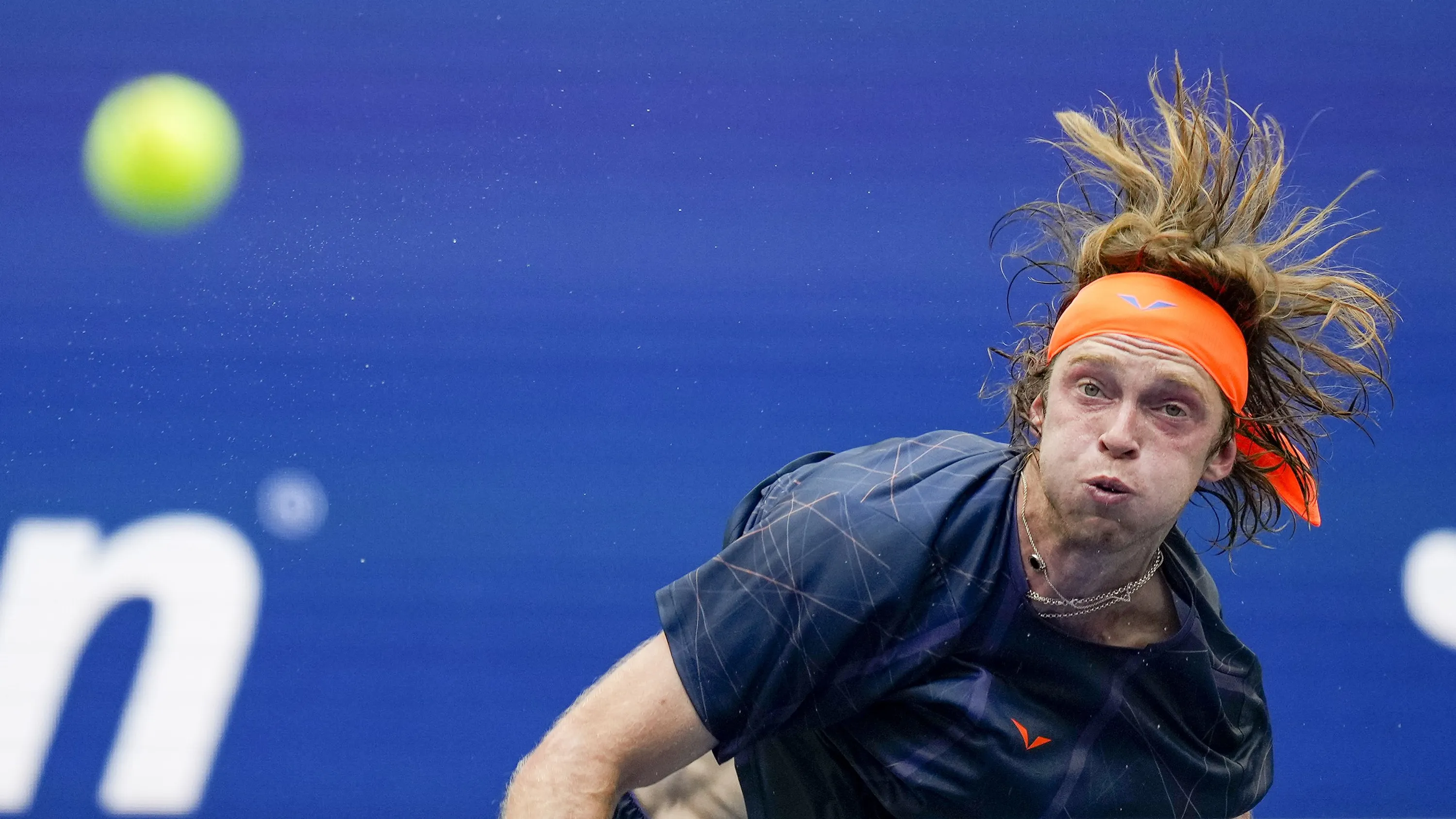 Andrey Rublev, of Russia, serves to Daniil Medvedev, of Russia, during the quarterfinals of the U.S. Open tennis championships, Wednesday, September 6, 2023, in New York. (Photo by Seth Wenig/AP Photo)