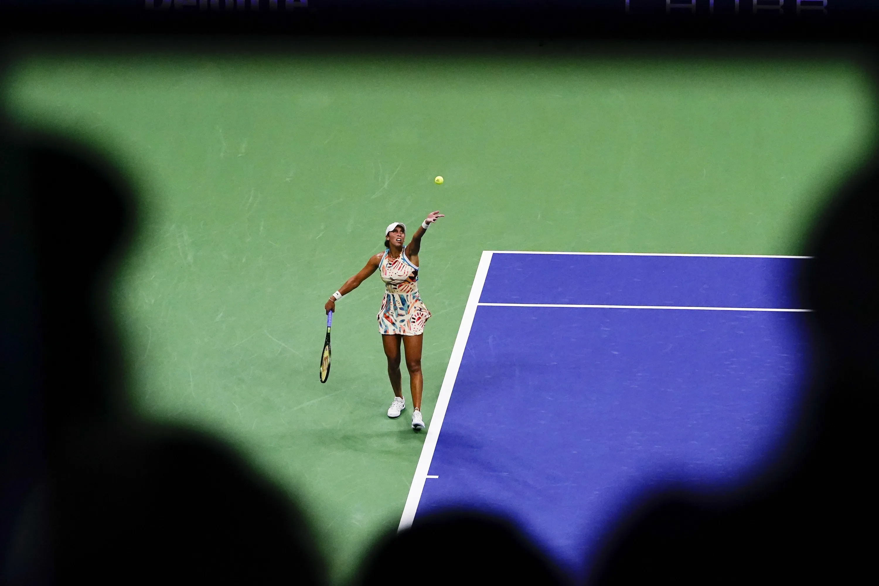 Madison Keys, of the United States, serves to Marketa Vondrousova, of the Czech Republic, during the quarterfinals of the U.S. Open tennis championships, Wednesday, September 6, 2023, in New York. (Photo by Frank Franklin II/AP Photo)