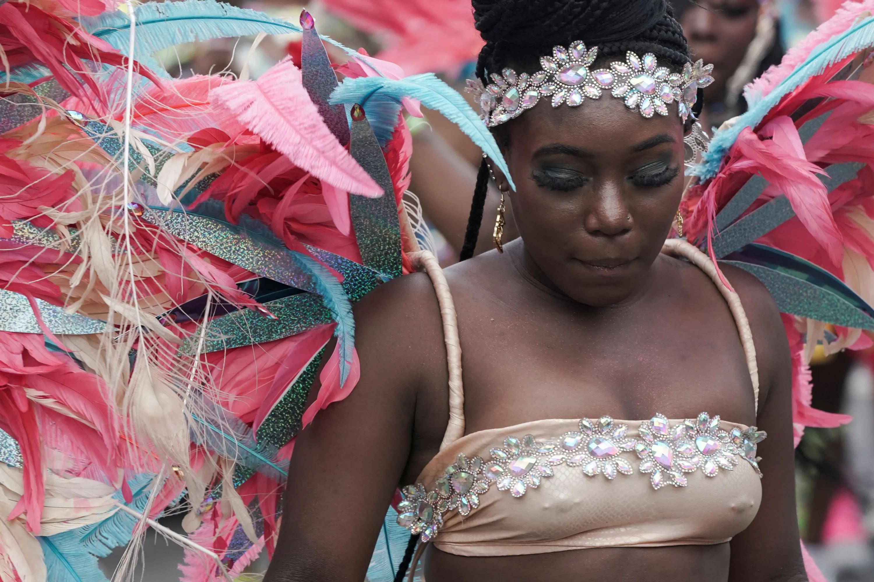 A performer in costume looks on during the annual West Indian American Day parade in the Brooklyn borough of New York City, New York, U.S., September 4, 2023. (Photo by Bing Guan/Reuters)